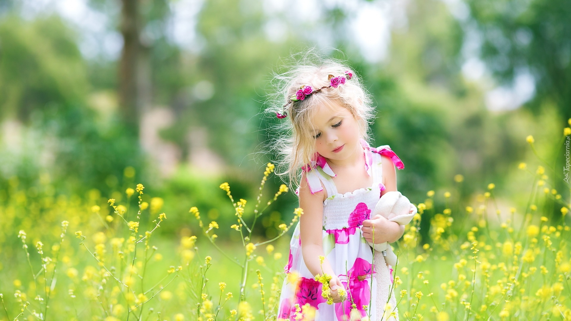 Edytor tapety: Dziewczynka w wianku zrywa polne kwiatki na łące