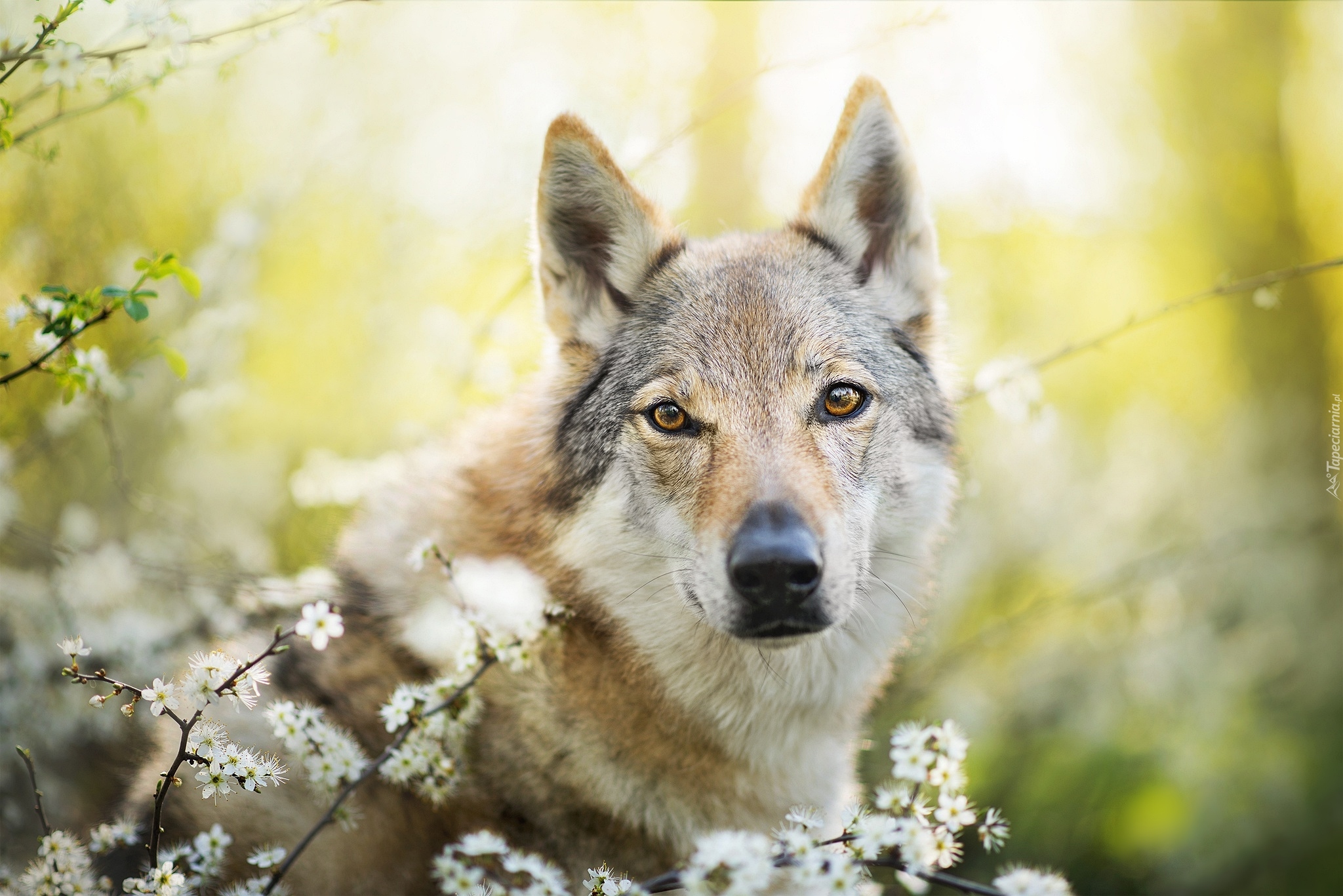 Edytor tapety: Wilczak czechosłowacki pośród gałązek z białymi kwiatkami