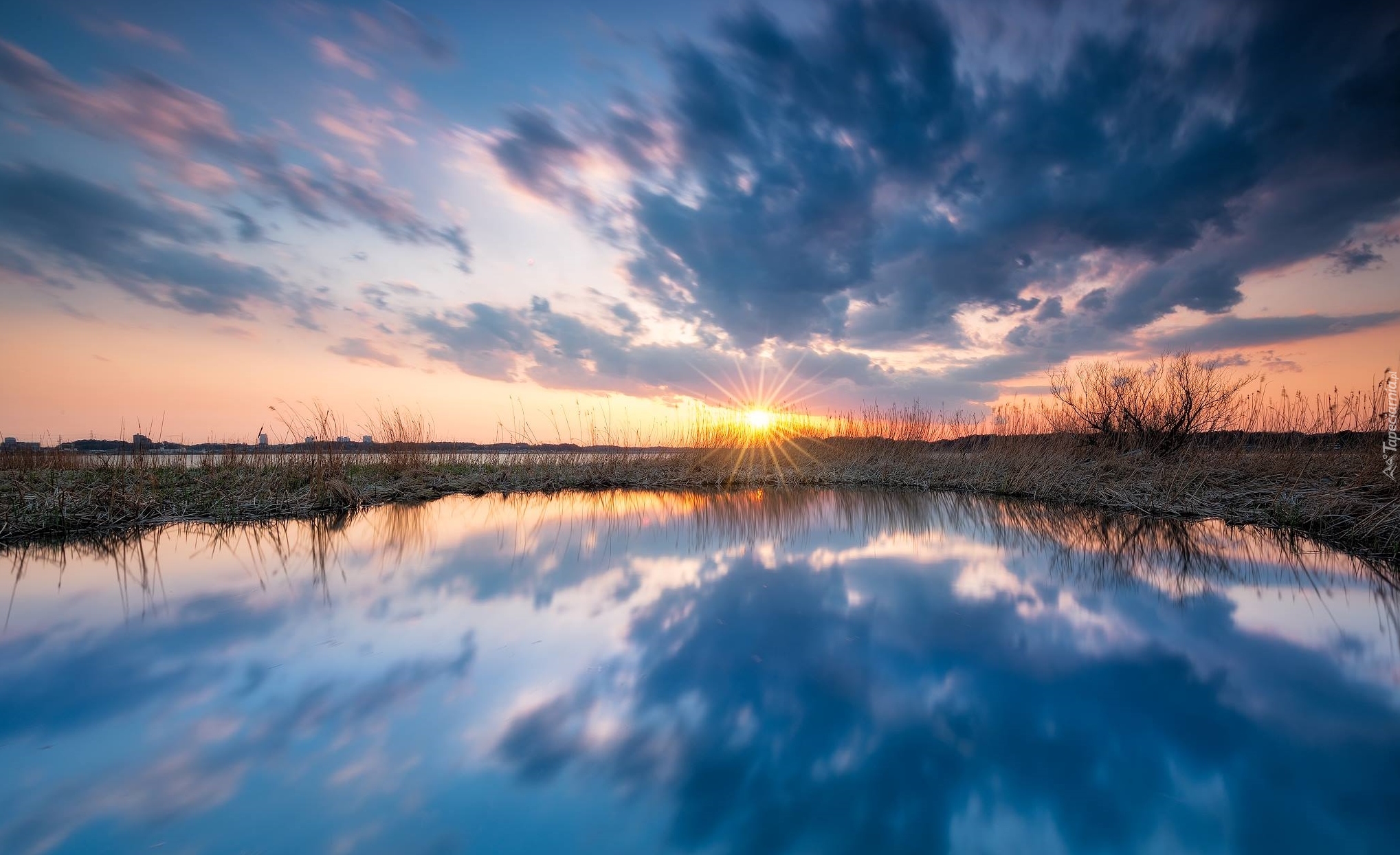 Edytor tapety: Chmury i promienie zachodzącego słońca nad jeziorem