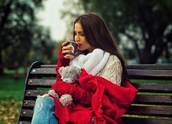 Edytor tapety: Brunetka pije kawę siedząc na ławce z pluszowym misiem