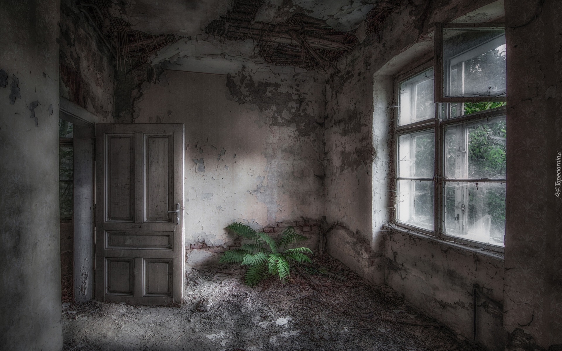Edytor tapety: Zielona paprotka w zniszczonym pokoju