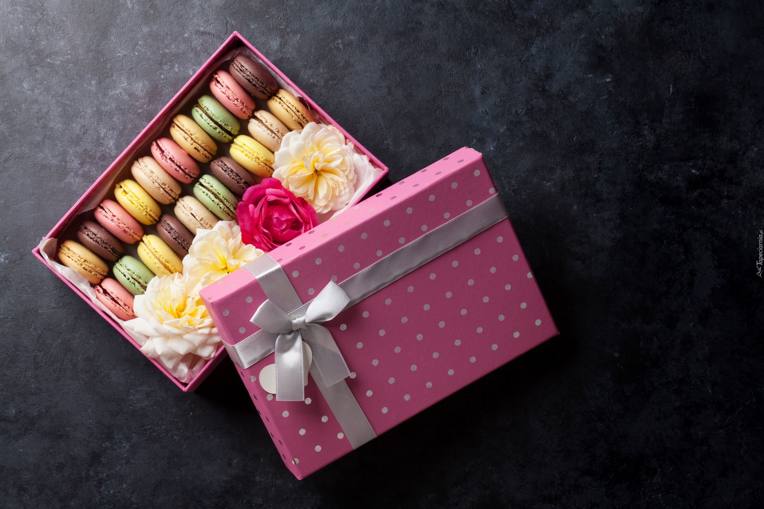 Edytor tapety: Ciastka makaroniki i róże w ozdobnym pudełku