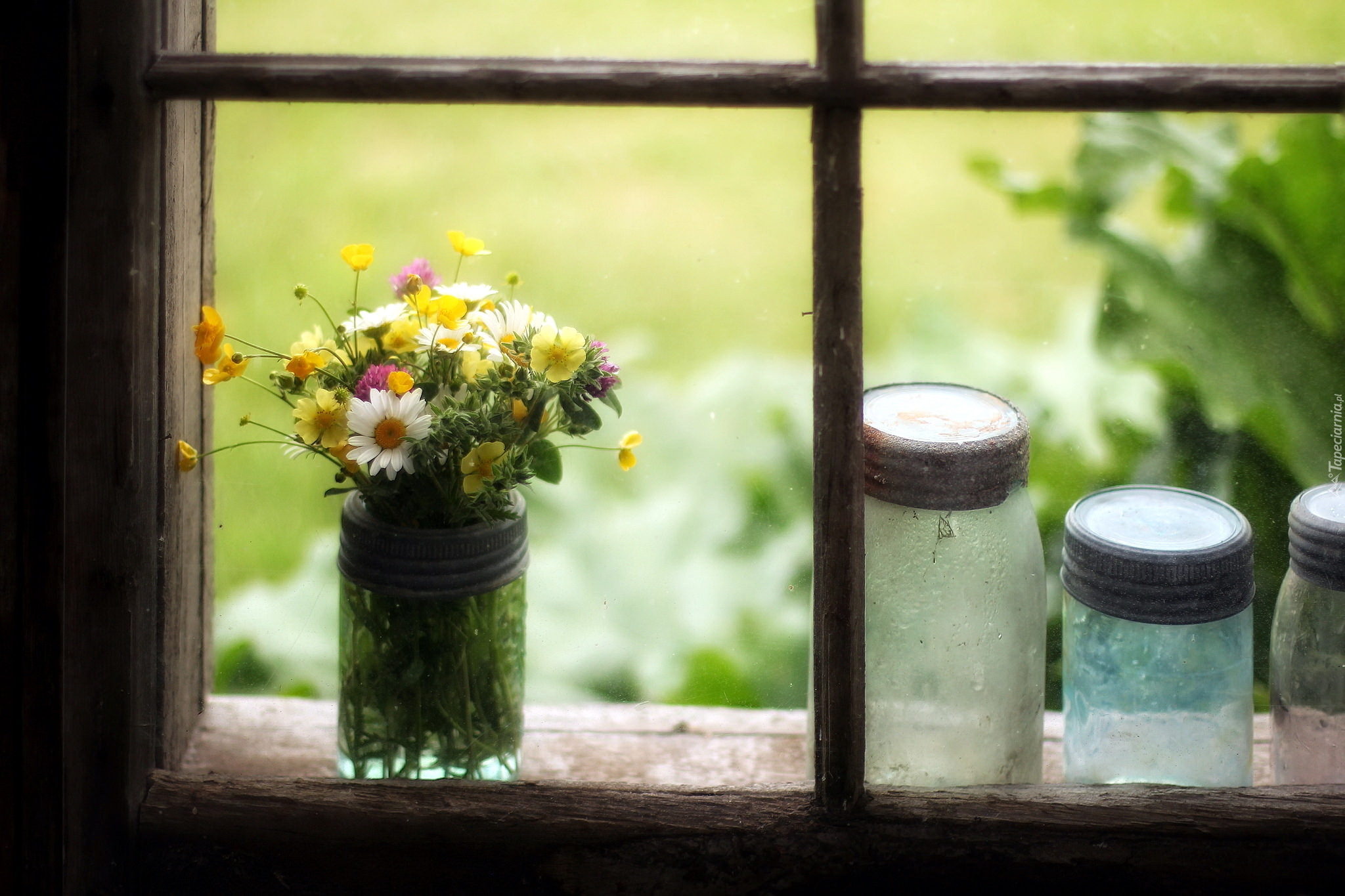 Edytor tapety: Słoik z bukietem polnych kwiatów na parapecie okna