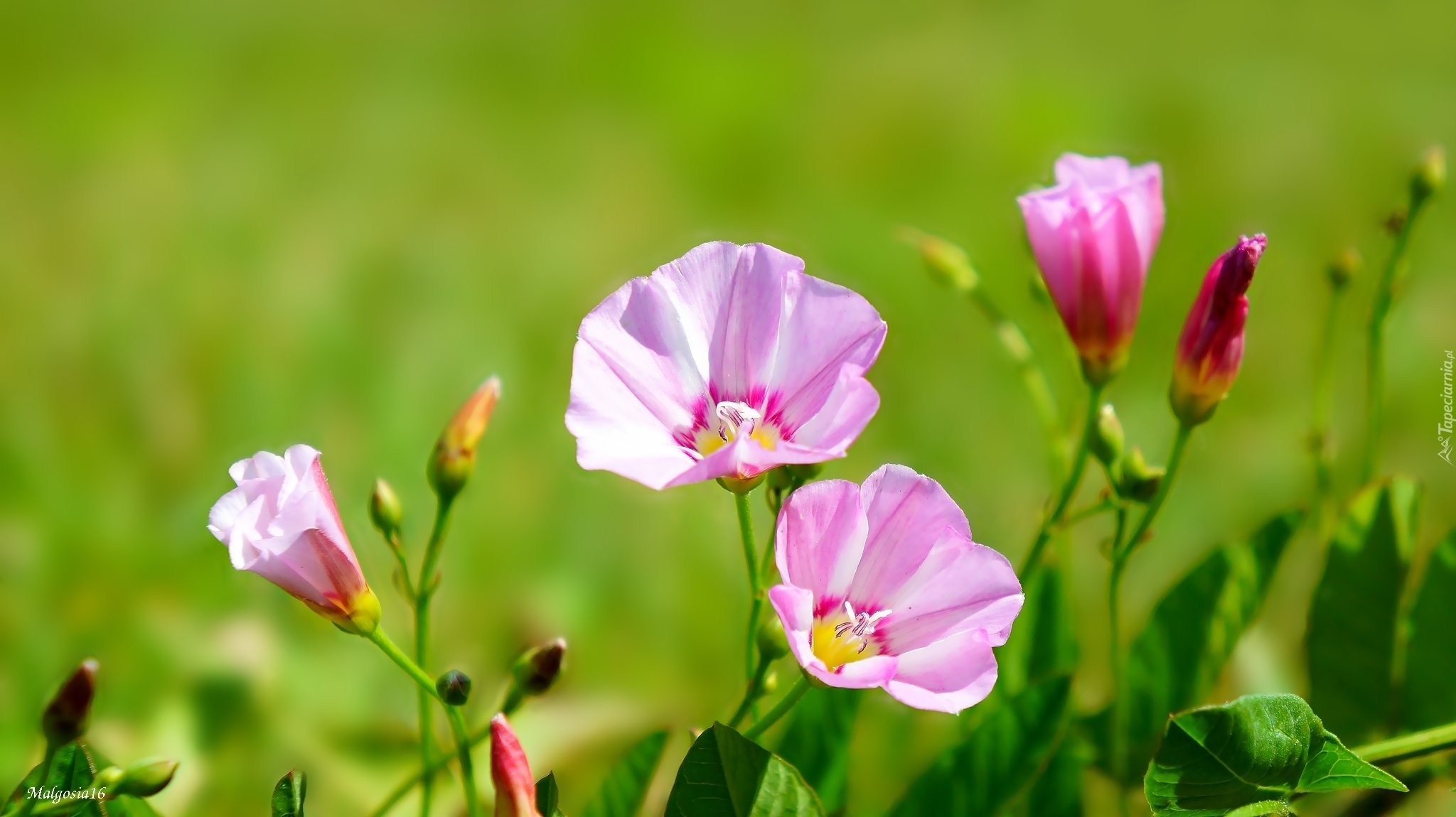 Edytor tapety: Różowe kwiaty powoju na łące w słońcu
