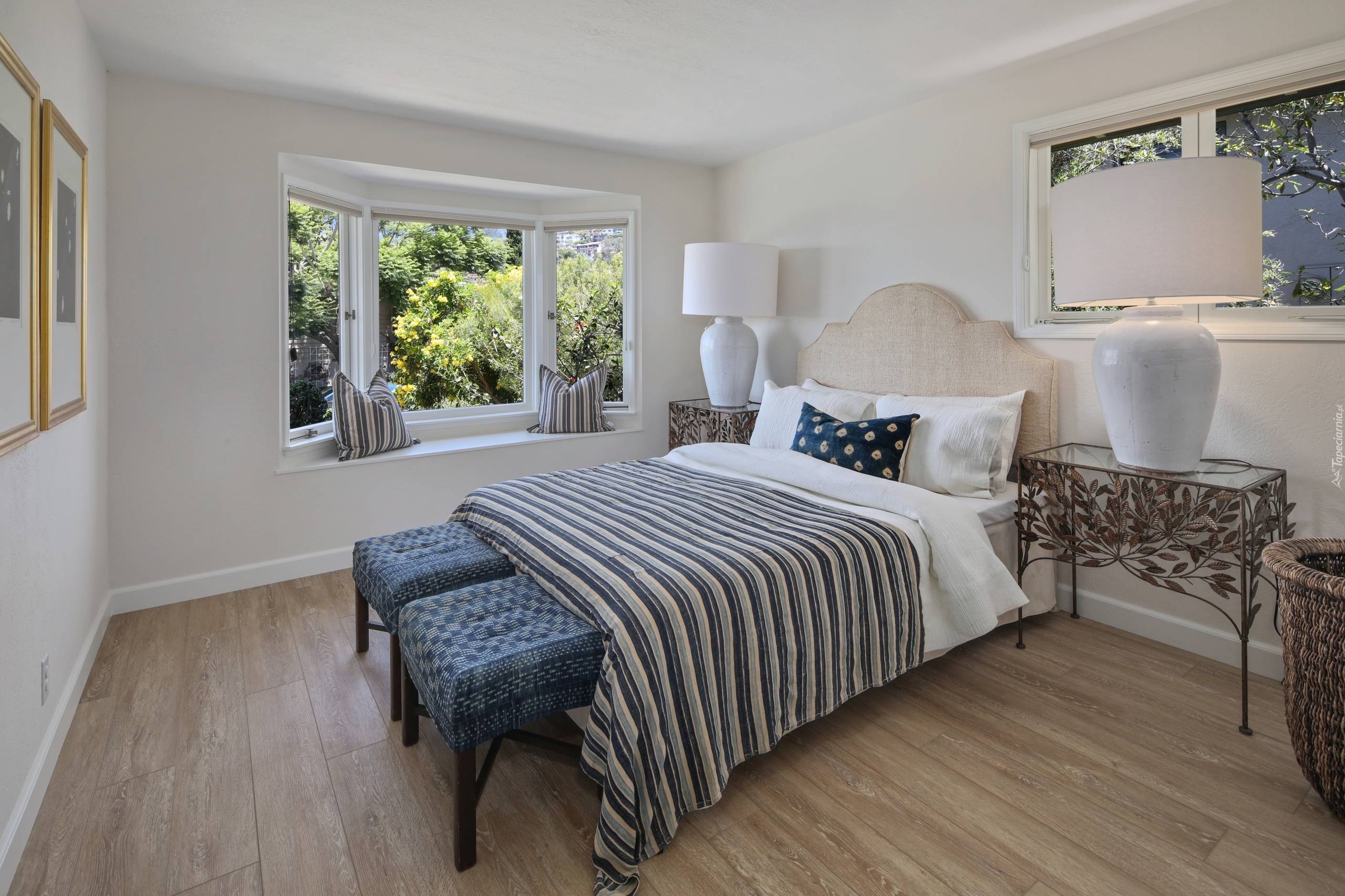 Edytor tapety: Umeblowana sypialnia z oknem wychodzącym na ogród