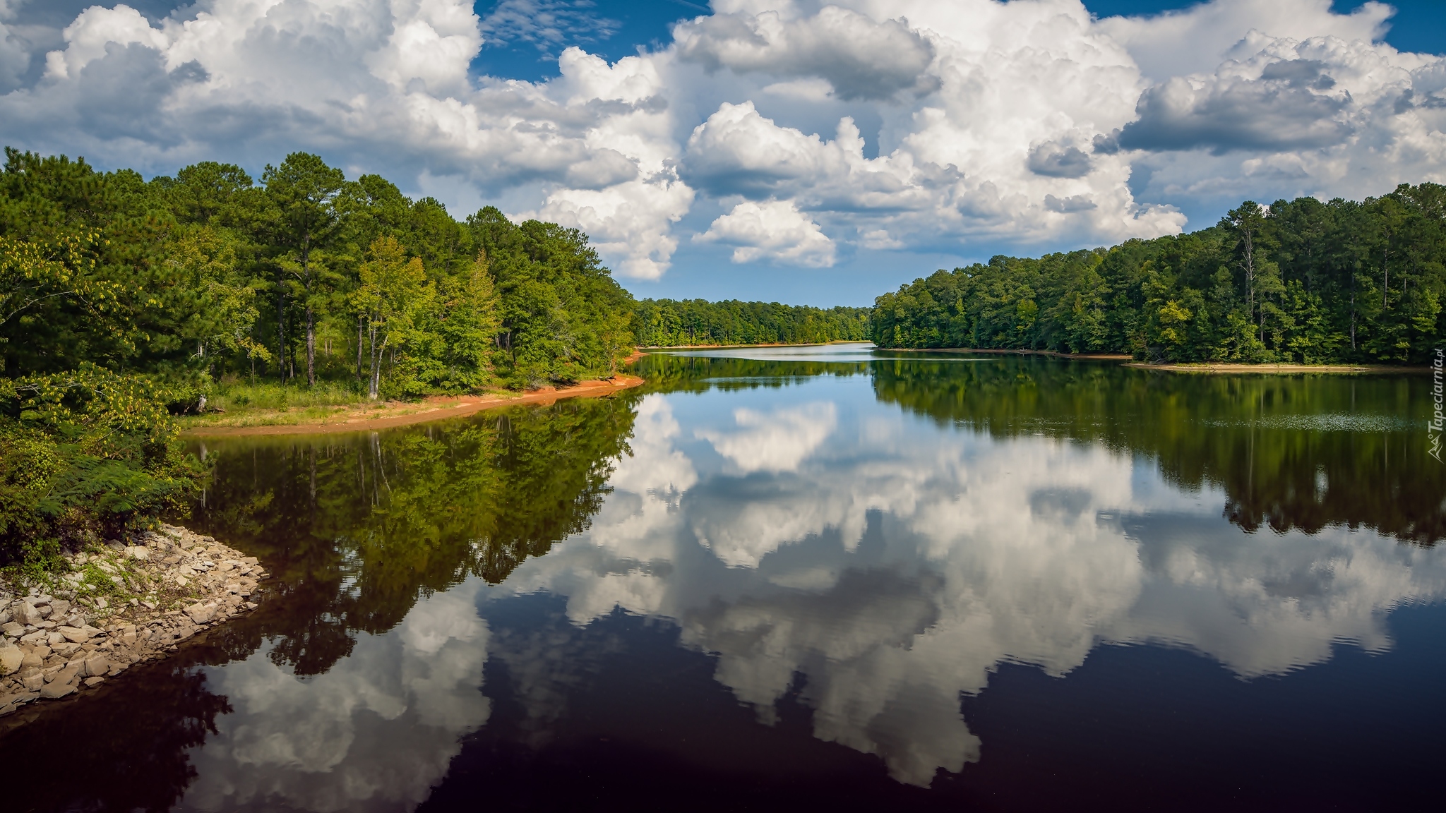 Edytor tapety: Kłębiaste chmury i drzewa odbijają się w rzece