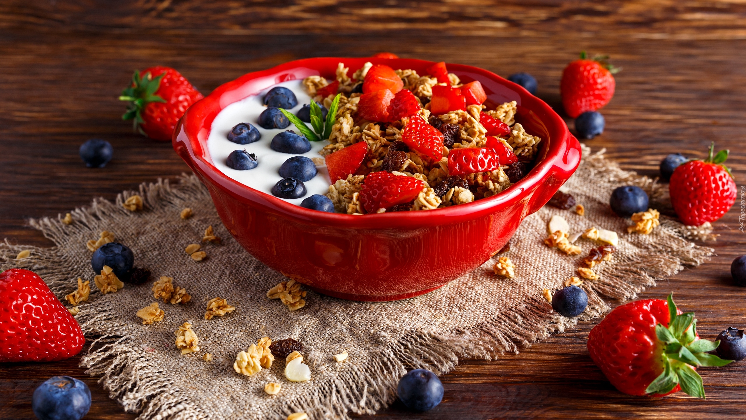 Edytor tapety: Jogurt z płatkami i owocami w miseczce
