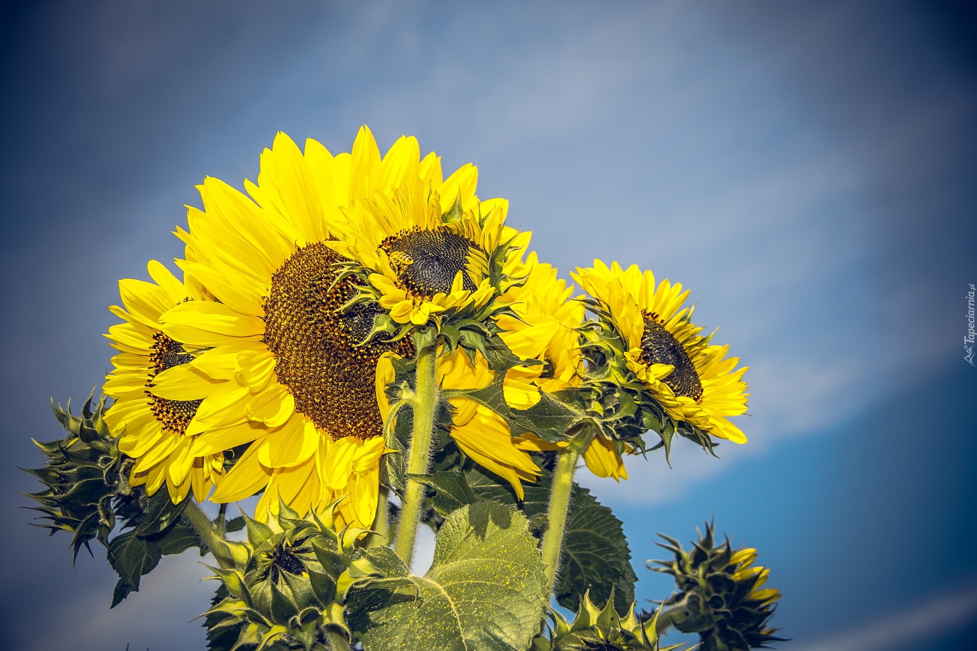 Edytor tapety: Słoneczniki ozdobne z niebem w tle