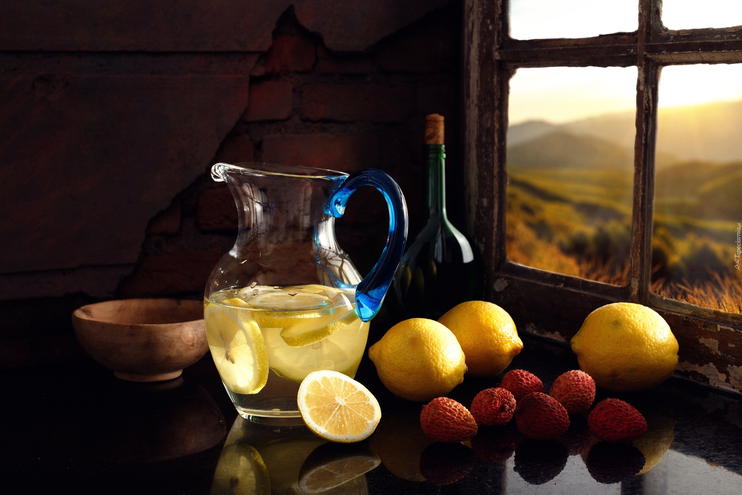 Edytor tapety: Cytryny obok dzbanka z lemoniadą na parapecie okna