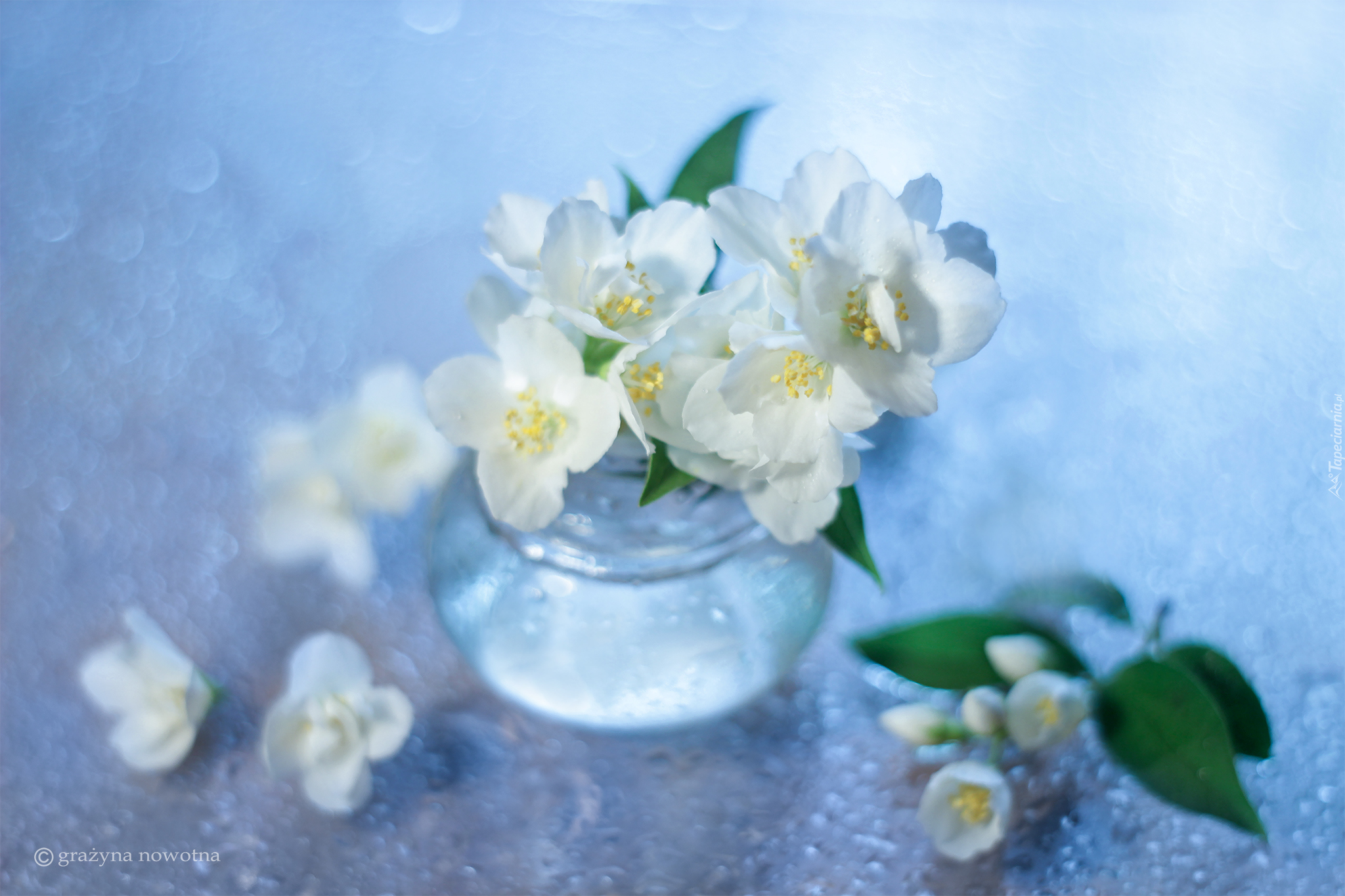 Edytor tapety: Białe kwiaty jaśminu w wazoniku na rozmytym tle
