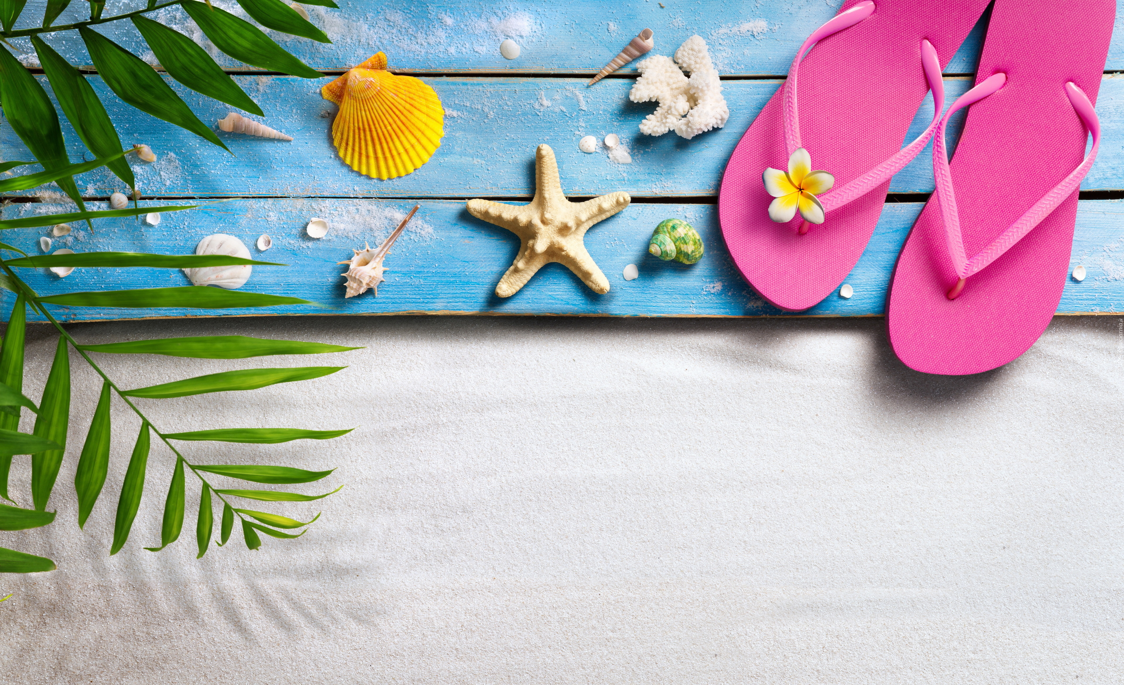 Edytor tapety: Plażowe klapki i muszelki ułożone na deskach