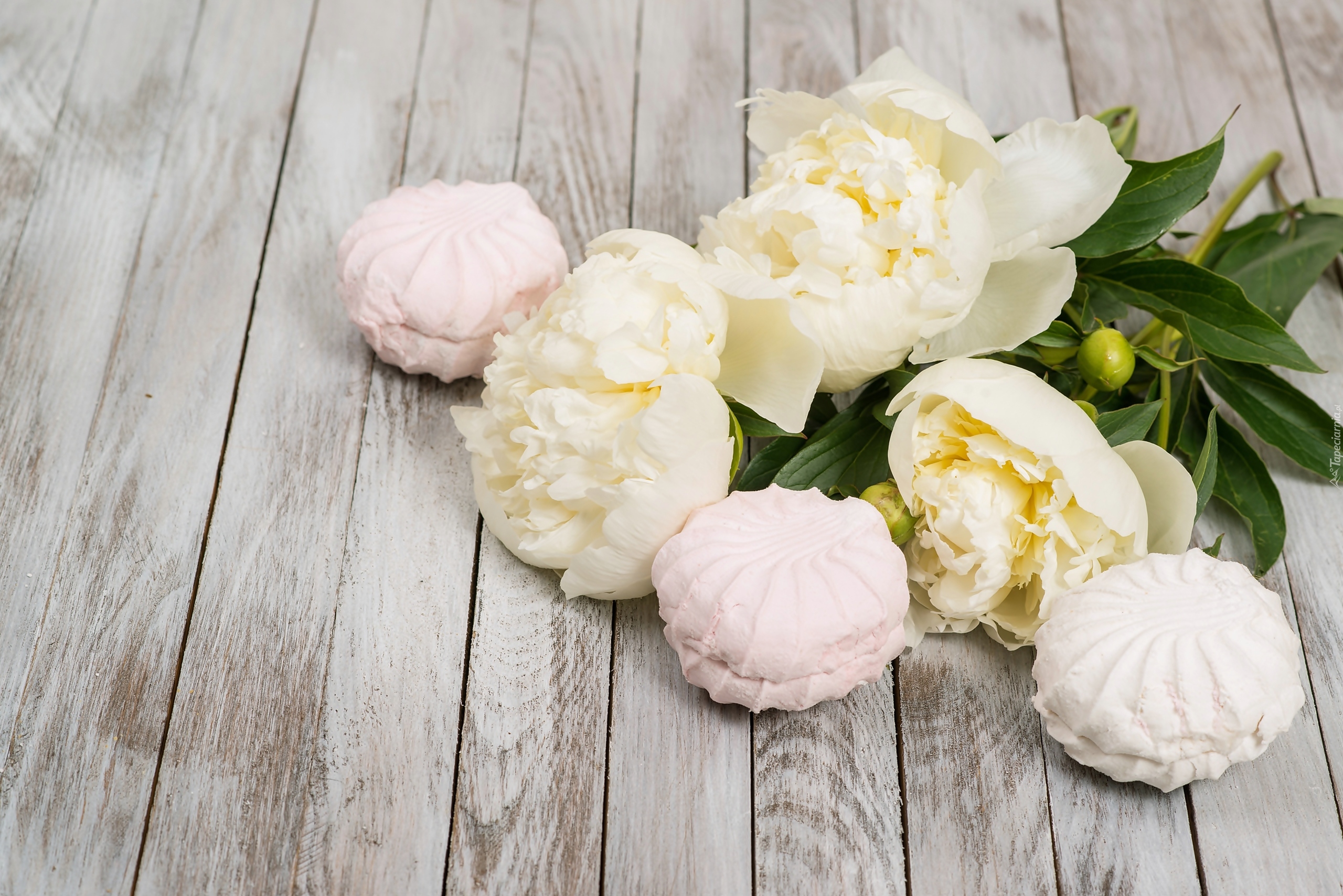 Edytor tapety: Bezy położone na deskach obok piwonii