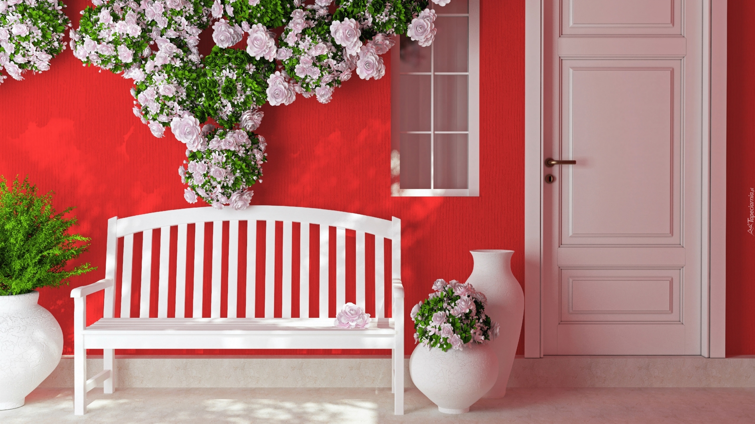 Edytor tapety: Biała ławeczka przed domem z różanym pnączem
