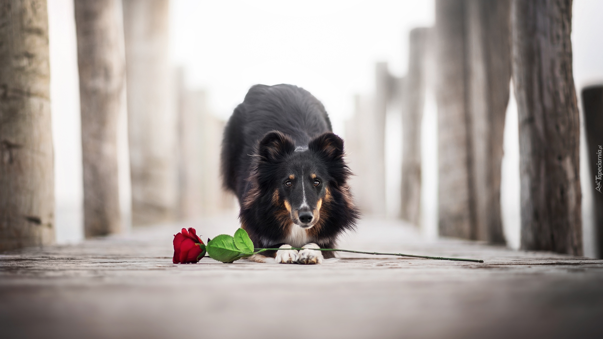 Edytor tapety: Czerwona róża na łapach warującego owczarka szetlandzkiego