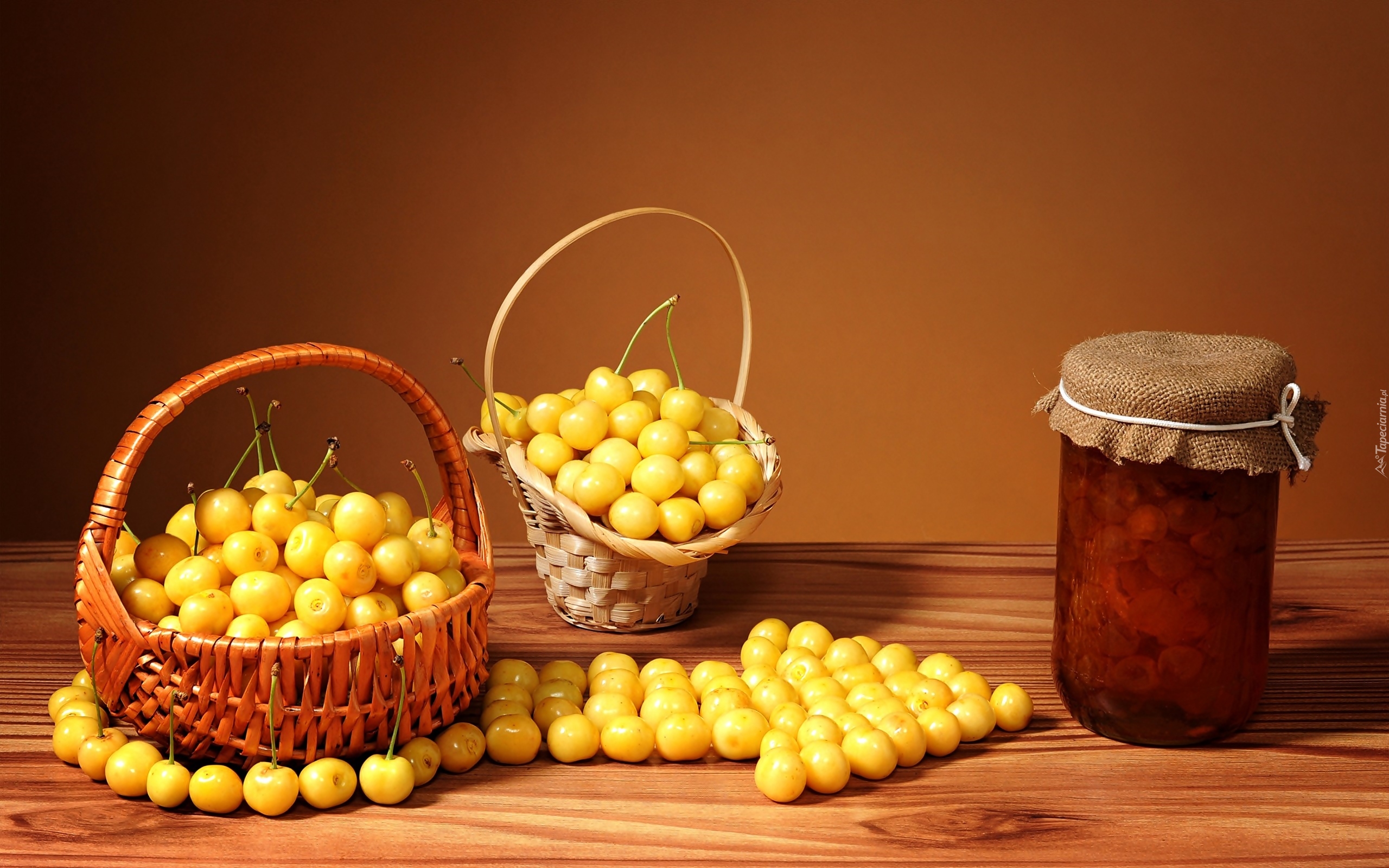 Edytor tapety: Czereśnie w koszykach obok konfitury w słoiku