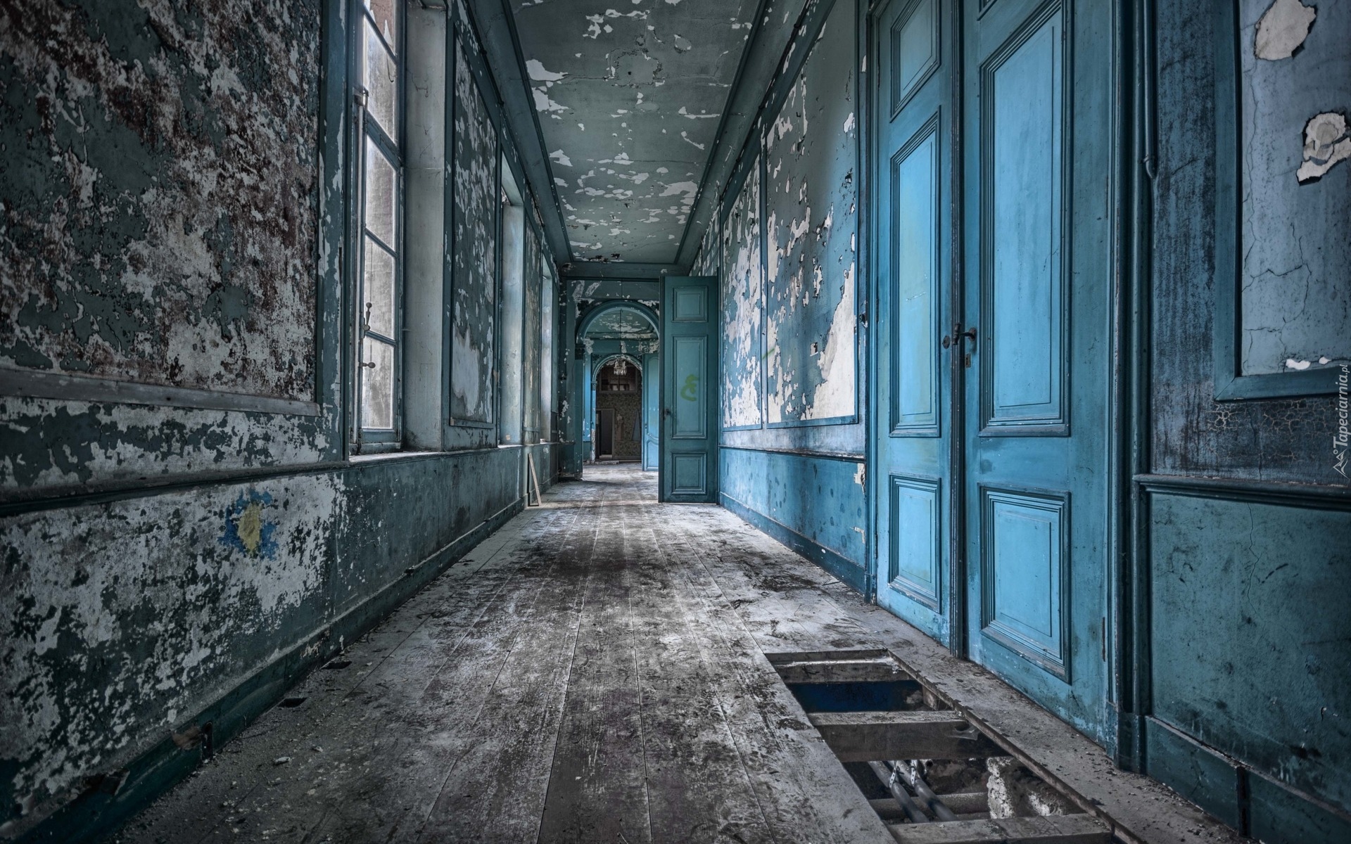 Edytor tapety: Zniszczone wnętrze z długim korytarzem