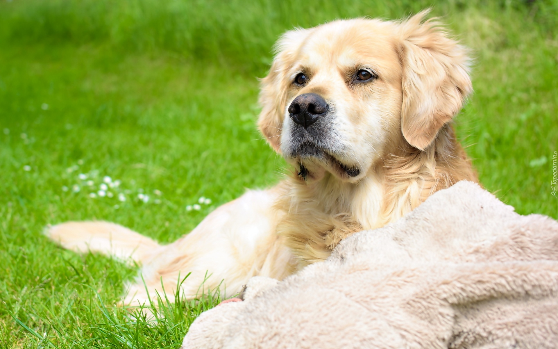 Edytor tapety: Golden retriever leży na trawie obok kocyka