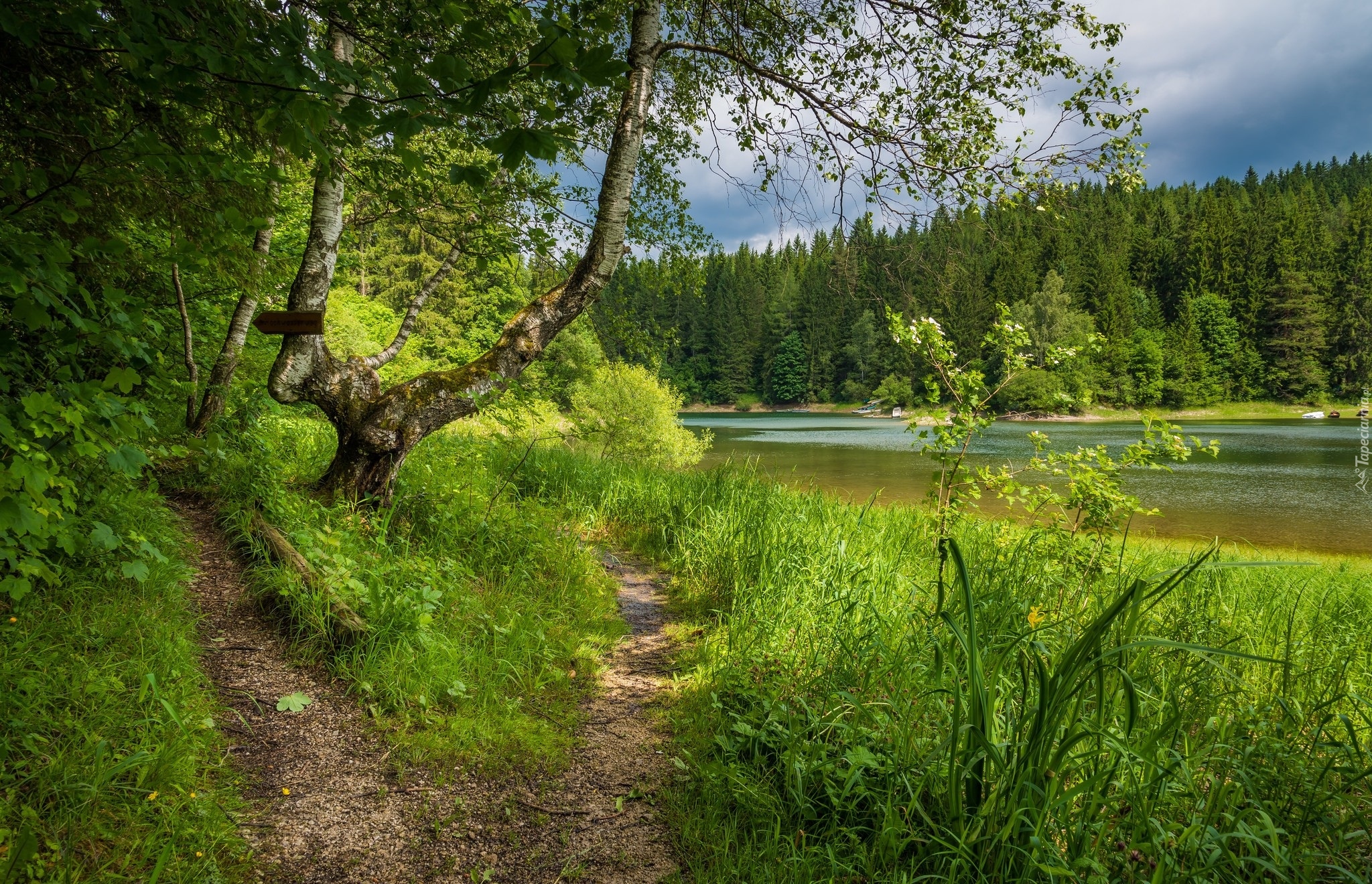Edytor tapety: Ścieżki przy leśnym jeziorze