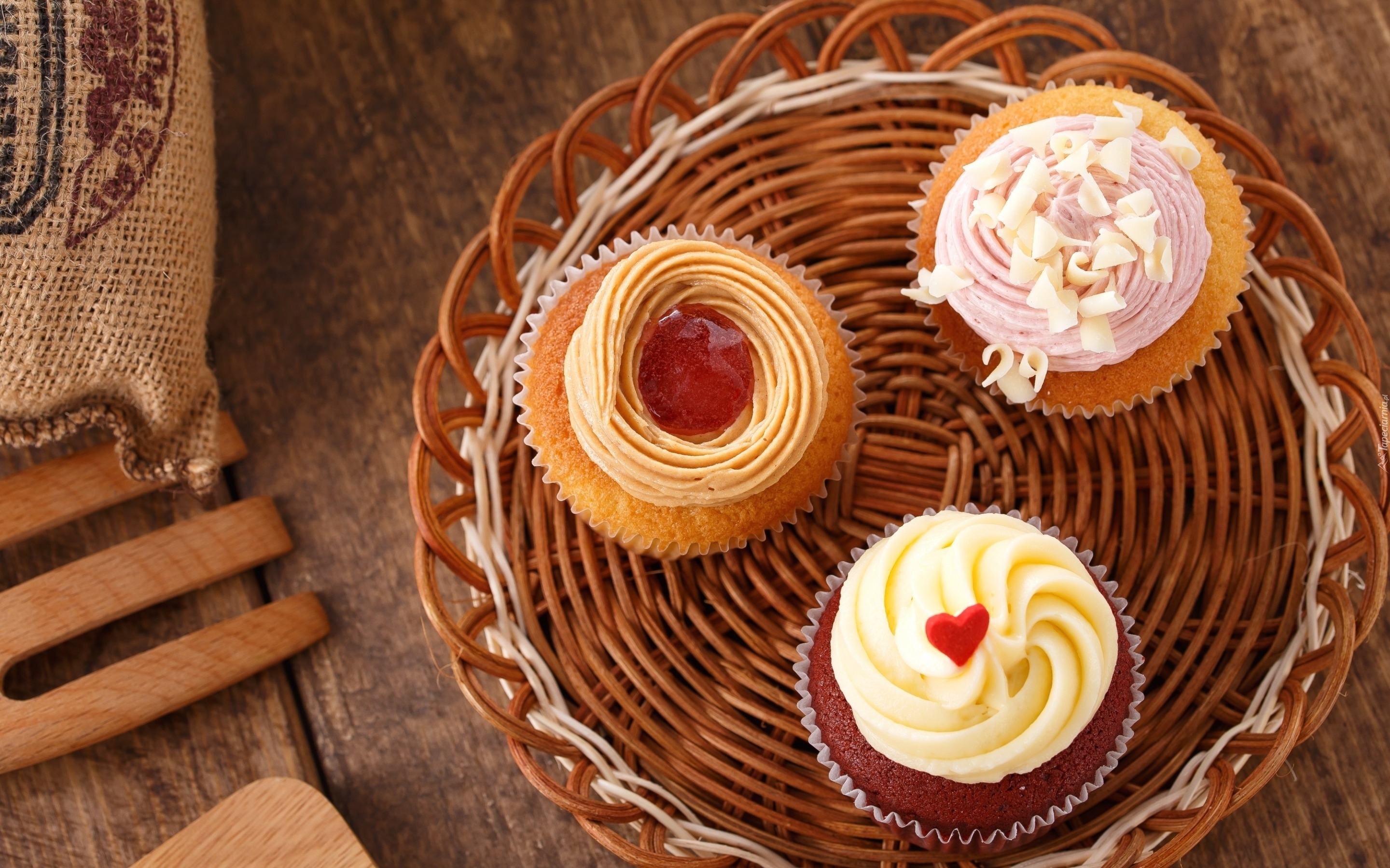 Edytor tapety: Trzy babeczki z kremem w koszyczku