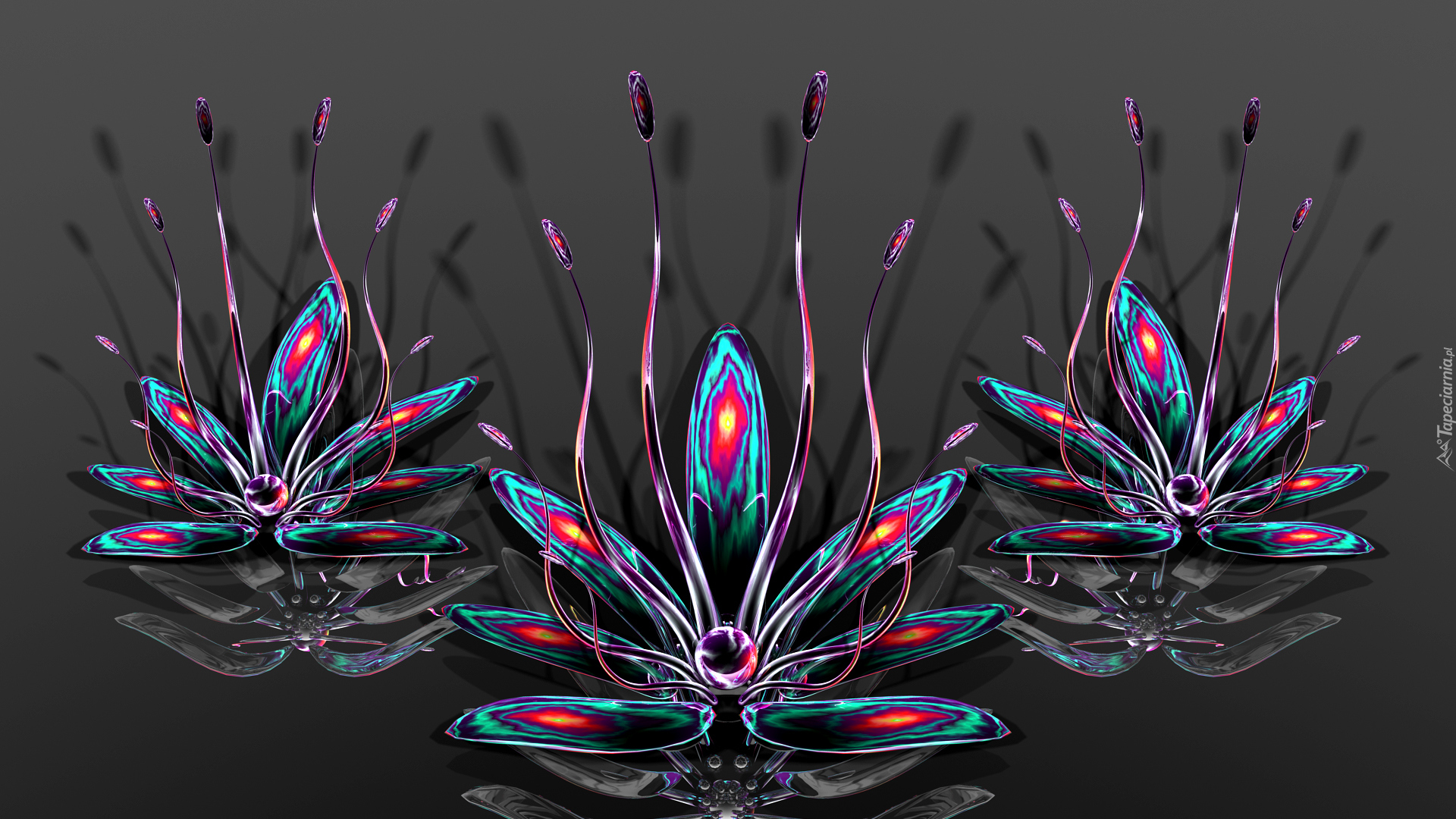Edytor tapety: Kolorowe rozłożyste kwiaty z pręcikami w grafice 3D