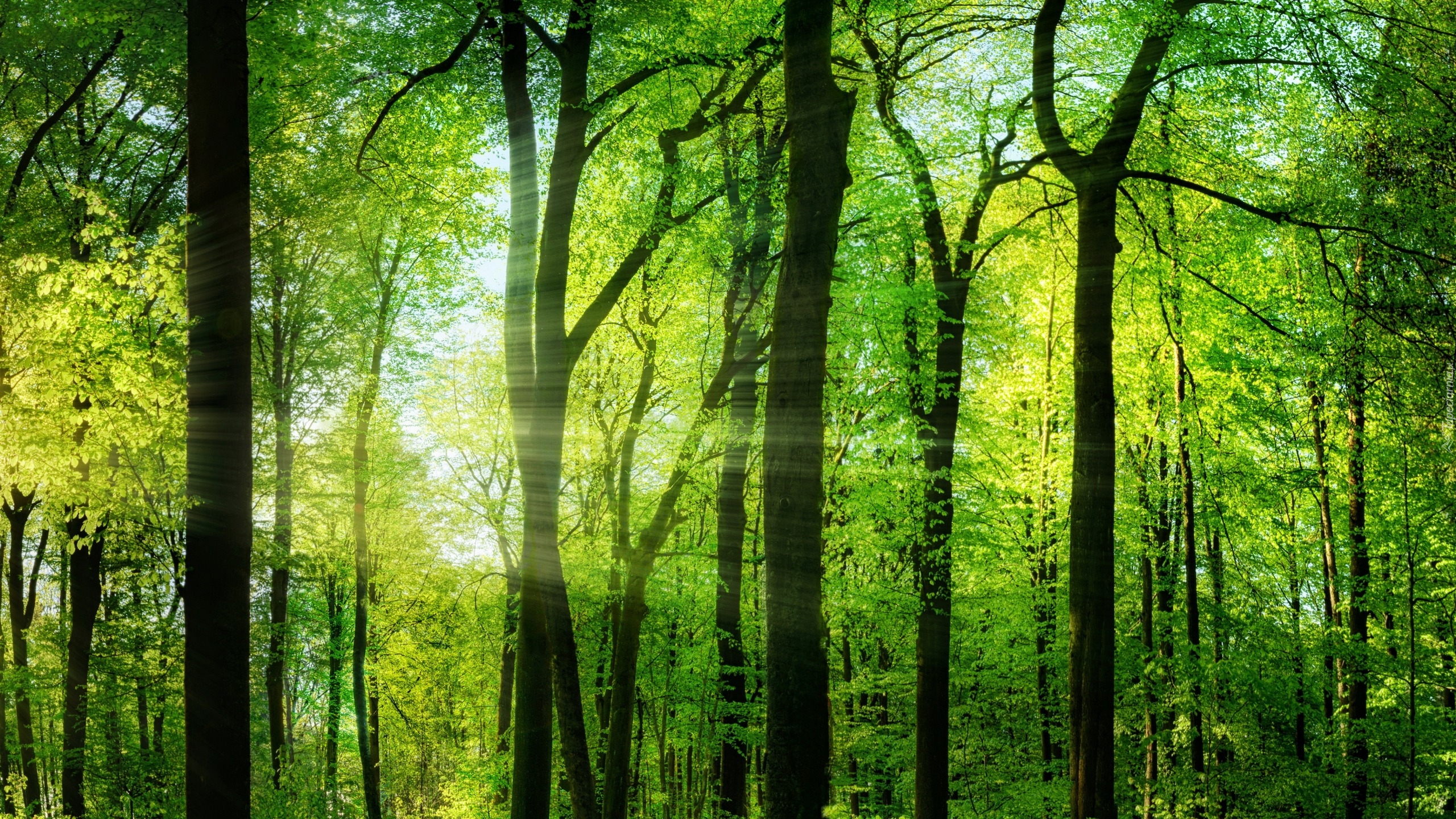 Edytor tapety: Promienie słońca w wiosennym lesie