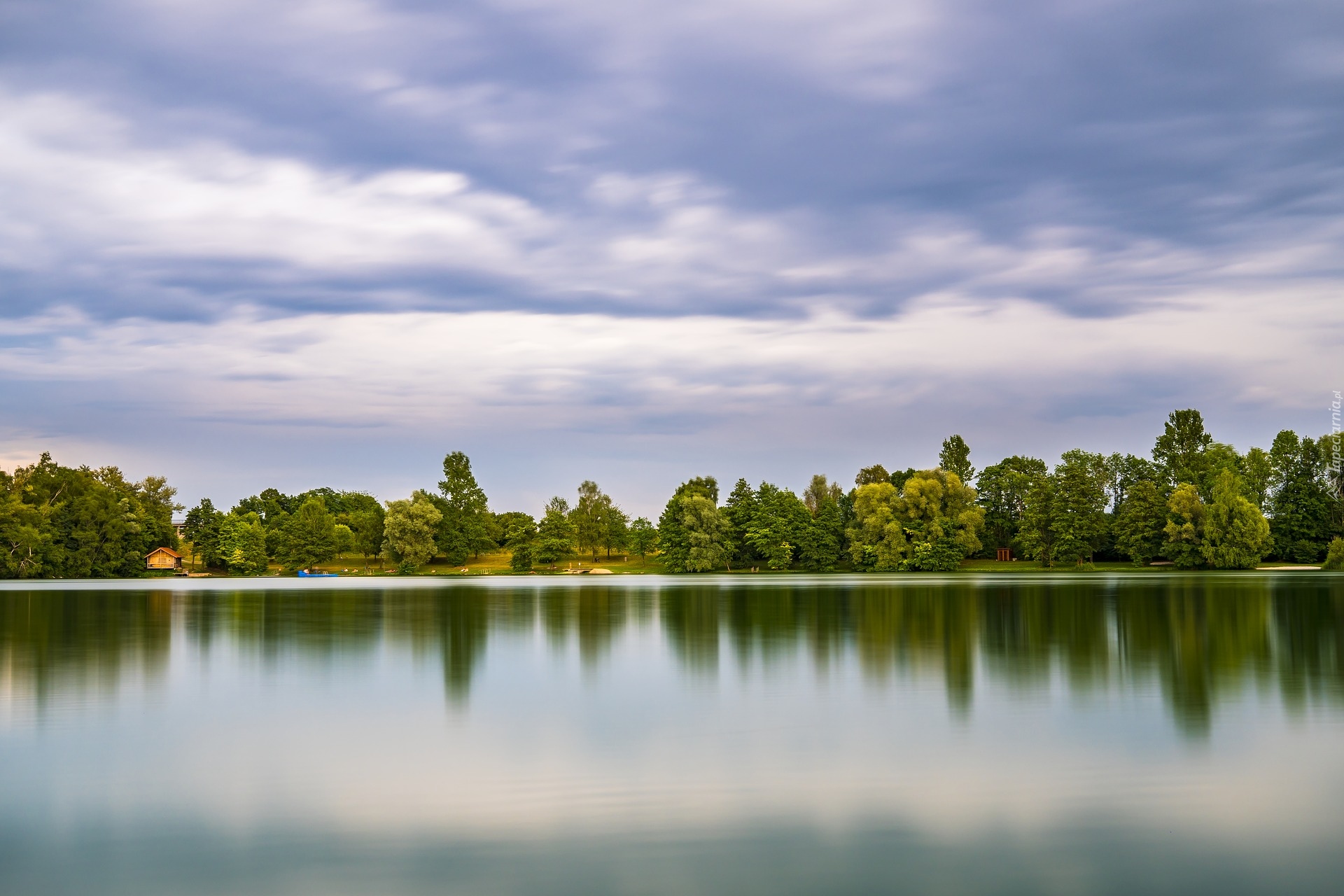Edytor tapety: Domek i drzewa przy brzegu jeziora latem