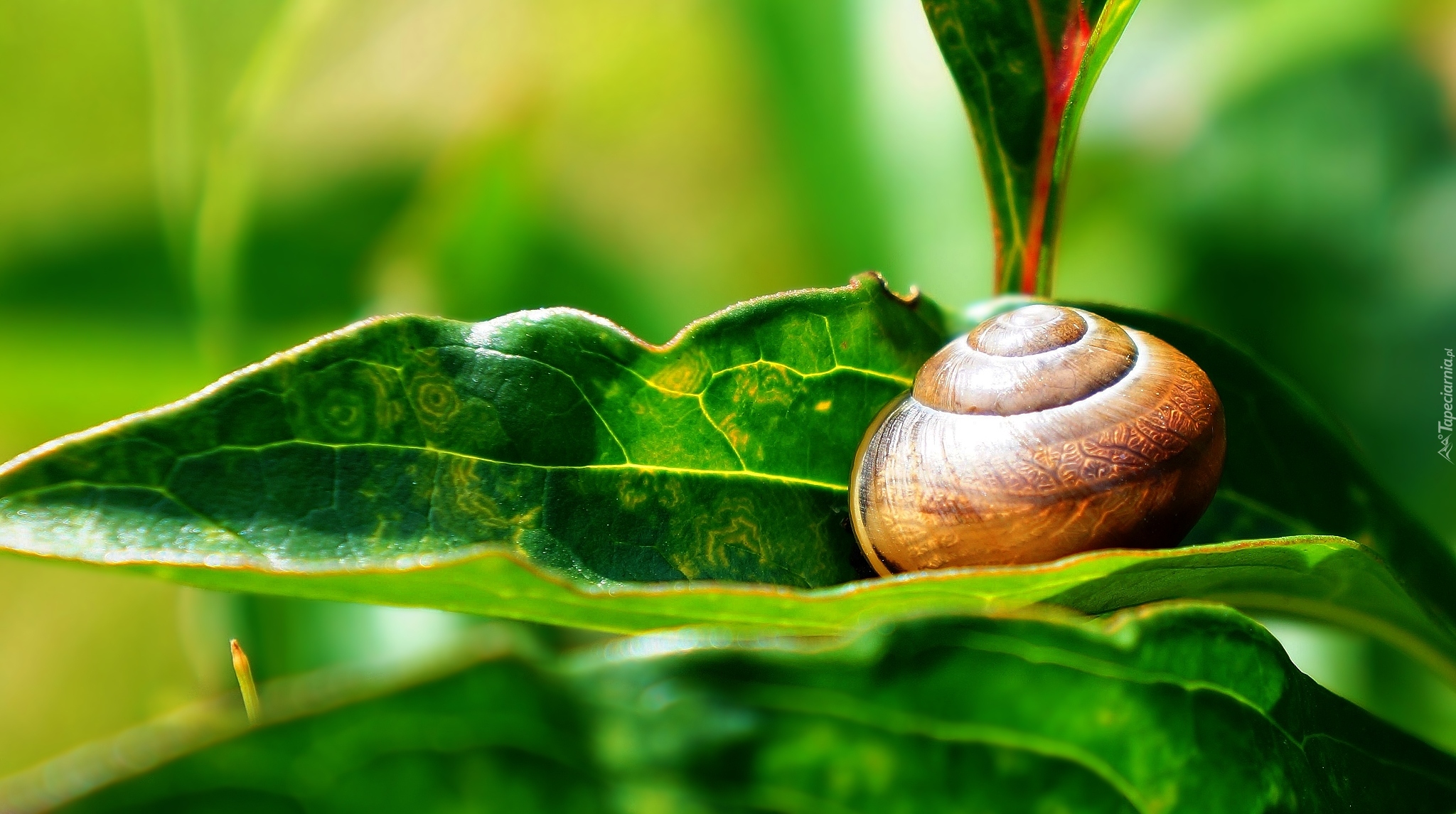 Edytor tapety: Muszla ślimaka na zielonym liściu