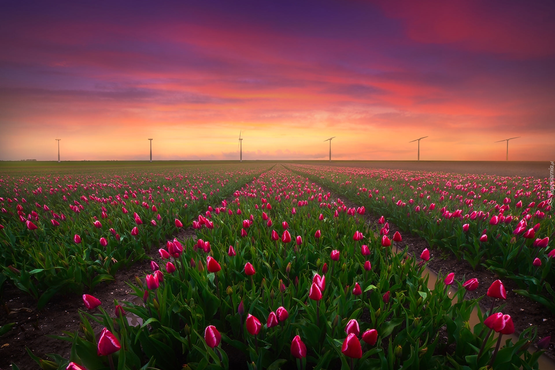 Edytor tapety: Plantacja tulipanów i wiatraki na tle nieba