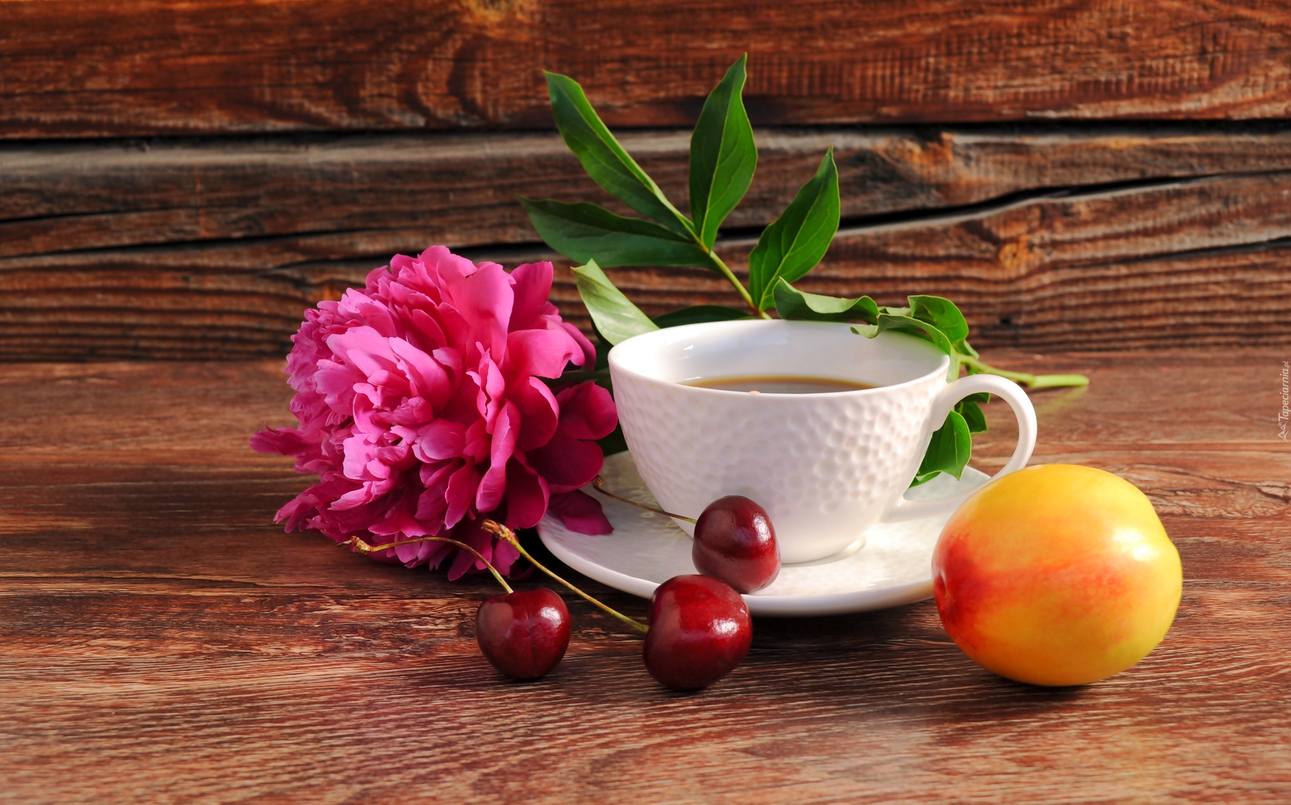 Edytor tapety: Kwiat piwonii położony obok filiżanki z kawą