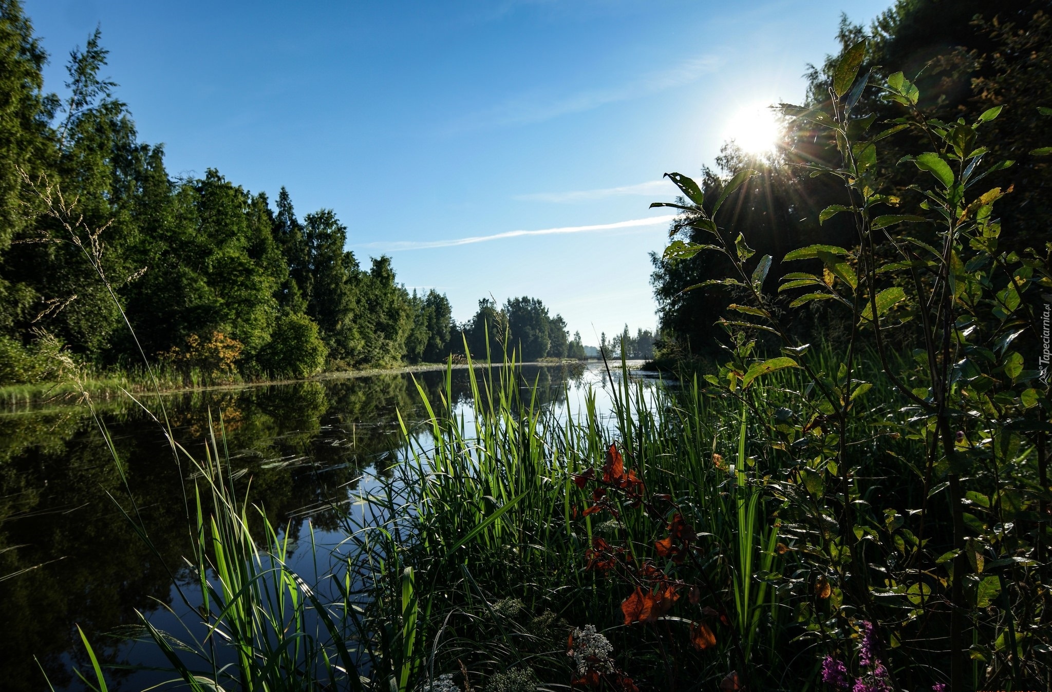 Edytor tapety: Promienie słońca nad rzeką porośniętą roślinami