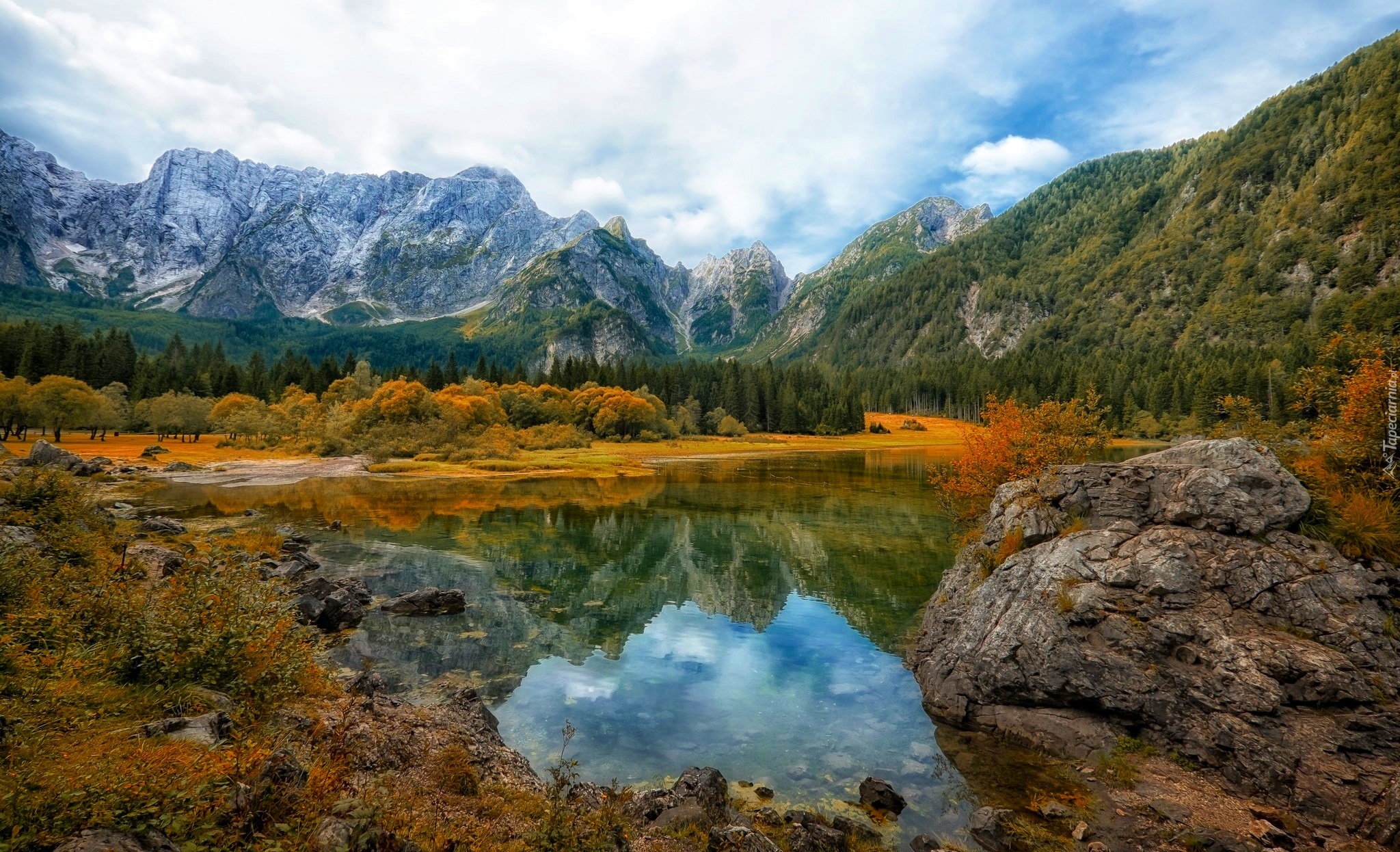 Edytor tapety: Jezioro w górach otoczone drzewami