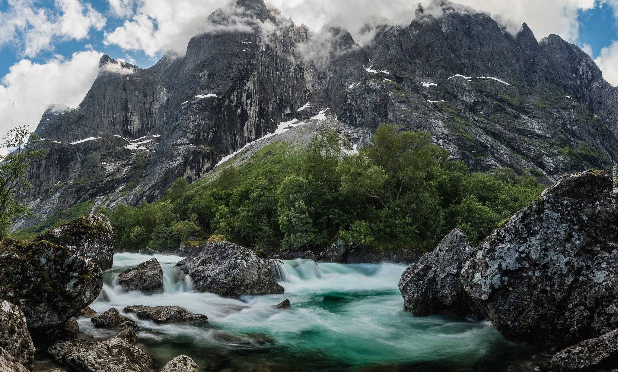 Edytor tapety: Rwąca rzeka płynąca po kamieniach w górach
