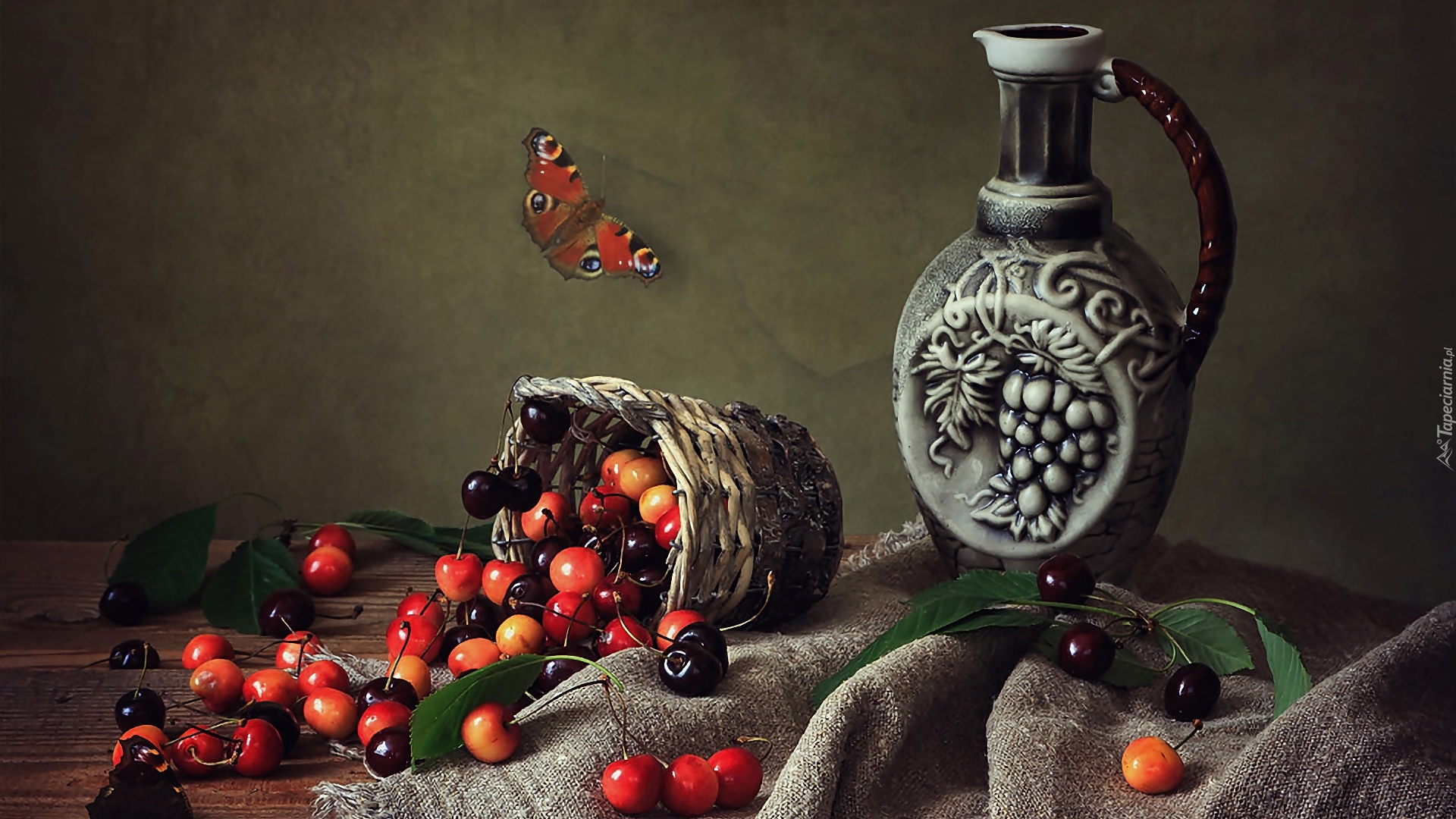 Edytor tapety: Dekoracyjny dzbanek i czereśnie wysypujące się z koszyka