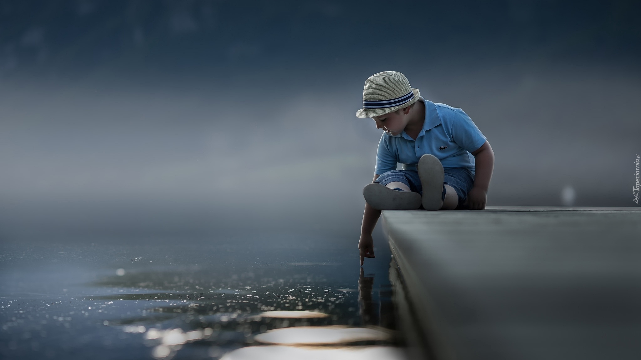 Edytor tapety: Chłopiec siedzący na rampie nad wodą