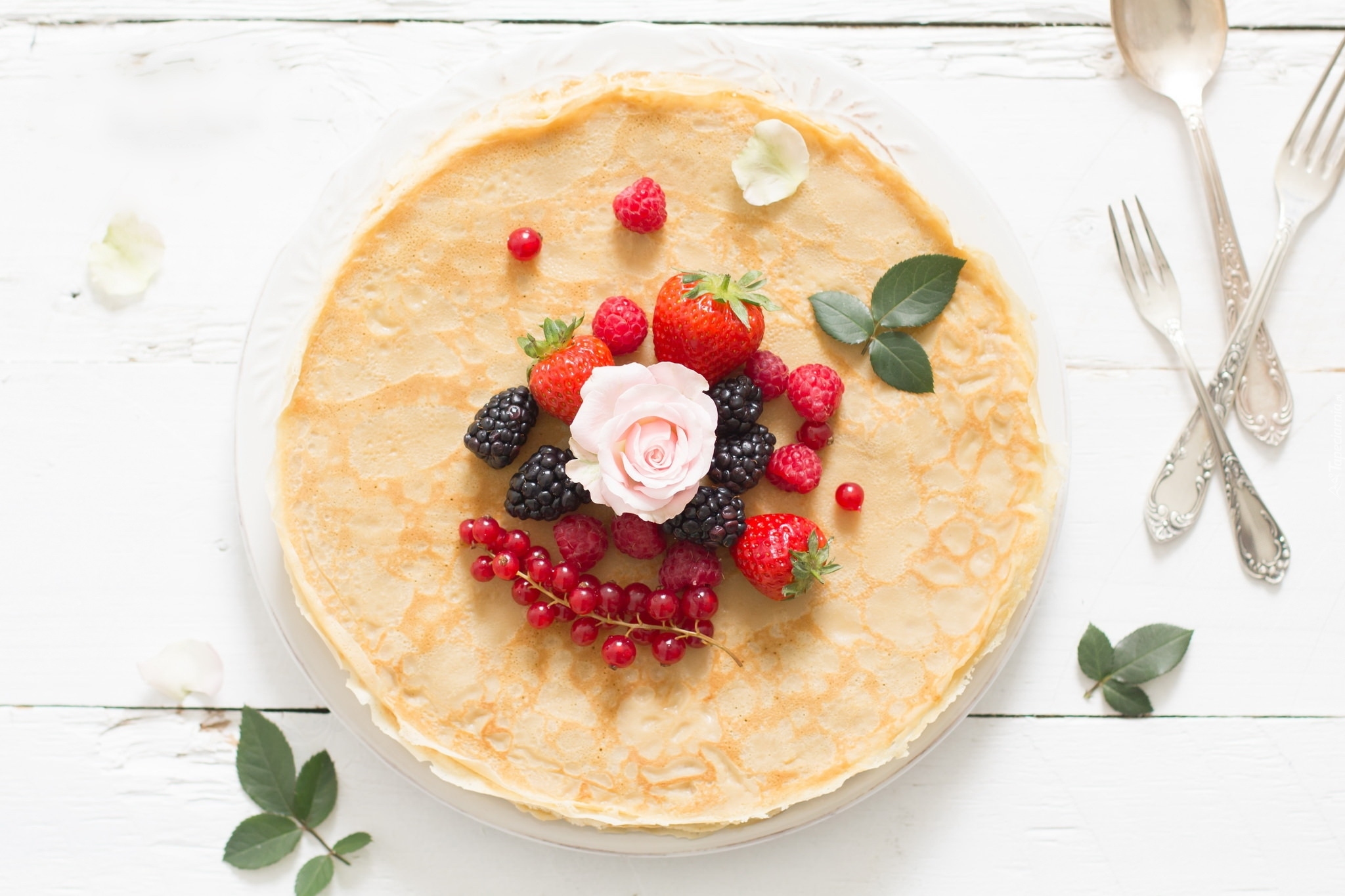 Edytor tapety: Naleśnik z owocami ozdobiony różą
