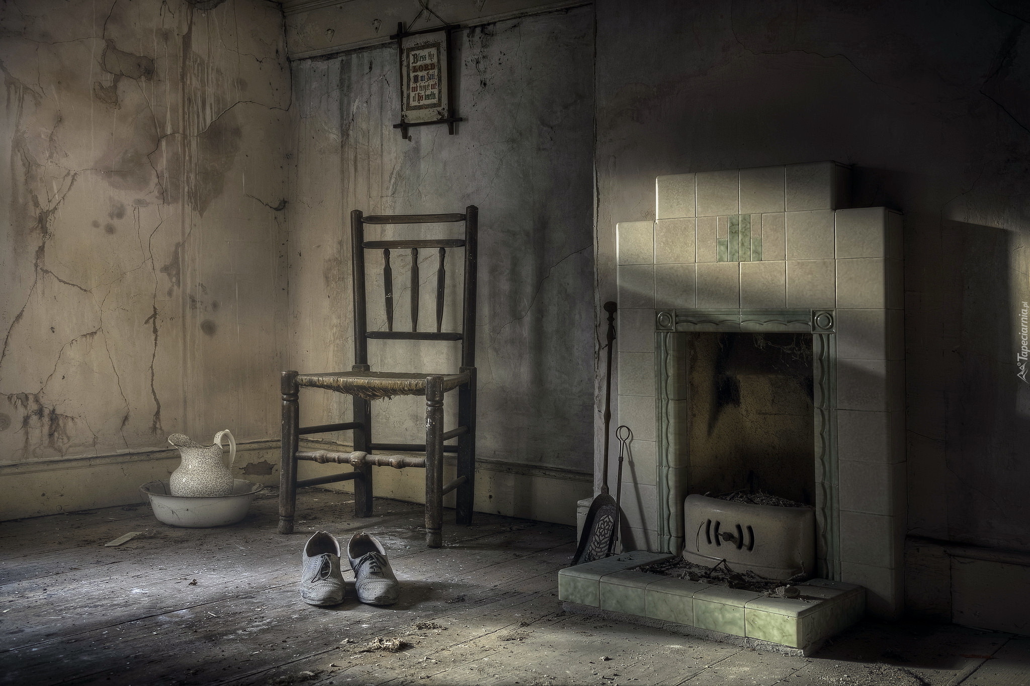 Edytor tapety: Zniszczone buty obok krzesła przy kominku