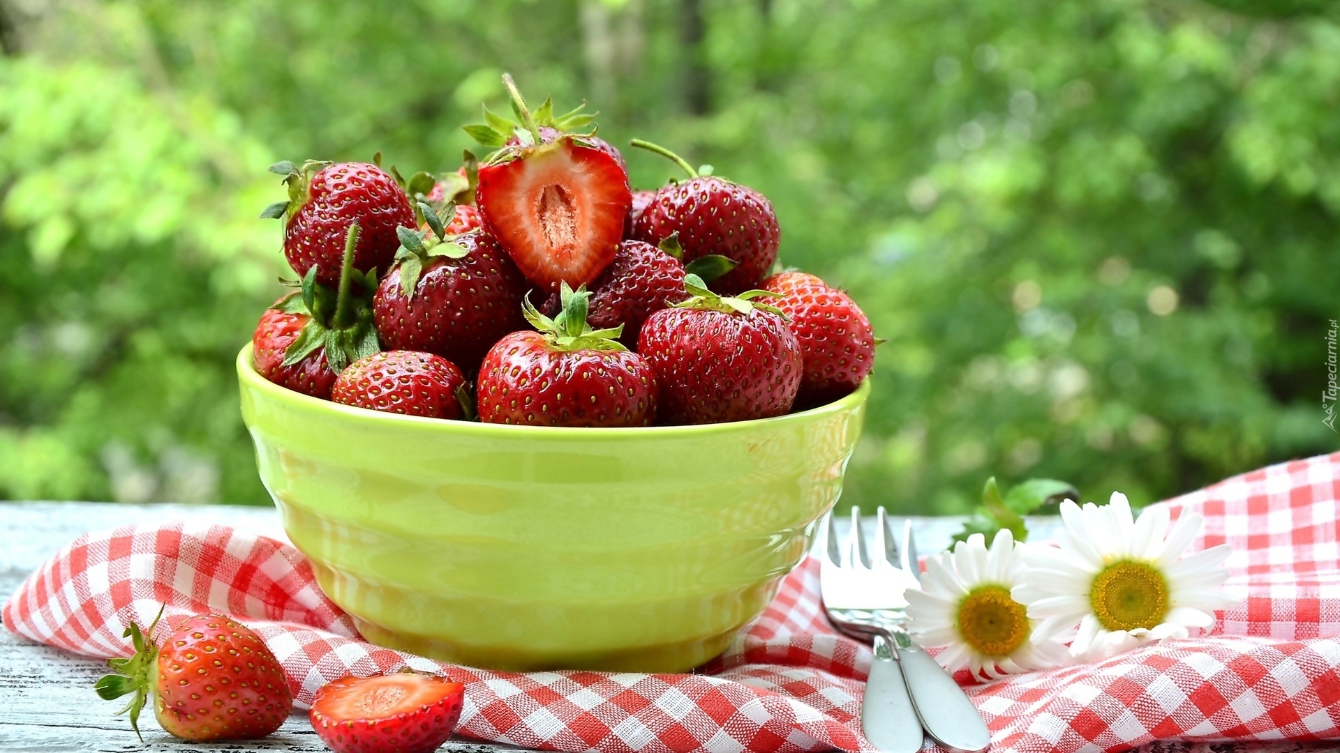 Edytor tapety: Truskawki w misce postawionej na ściereczce