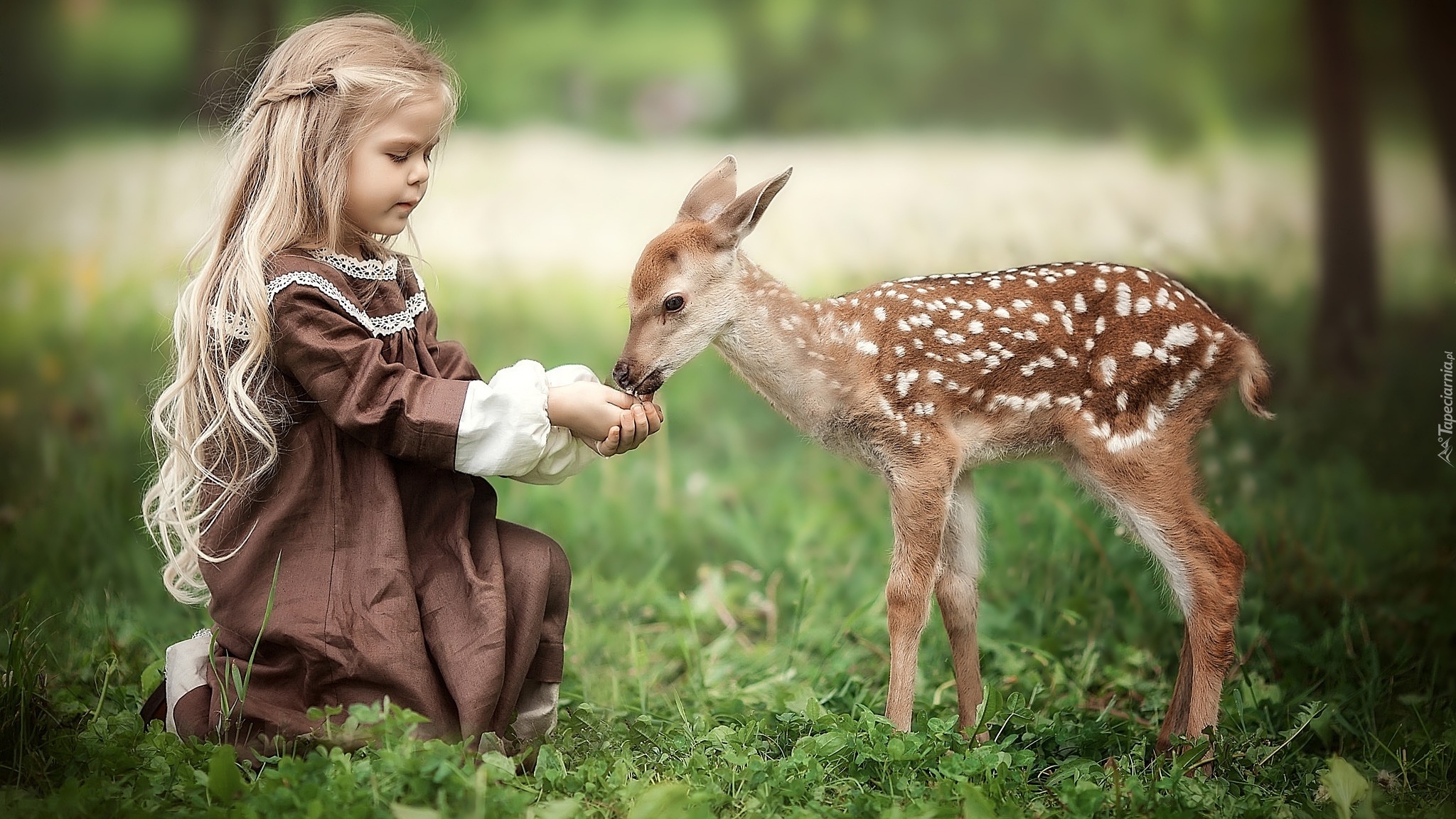 Edytor tapety: Blondwłosa dziewczynka karmi młode daniela