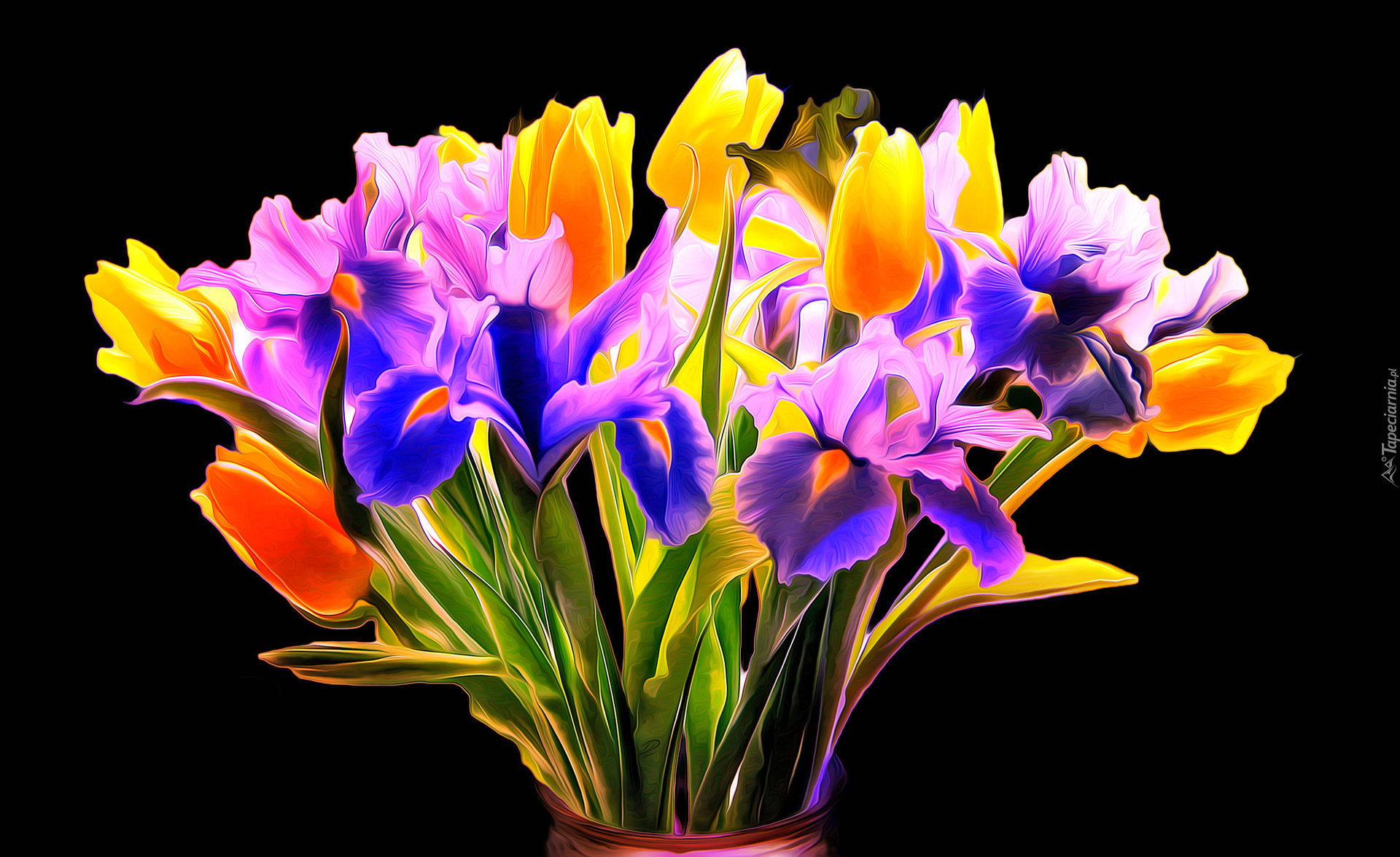 Edytor tapety: Bukiet irysów i tulipanów w grafice fractalius