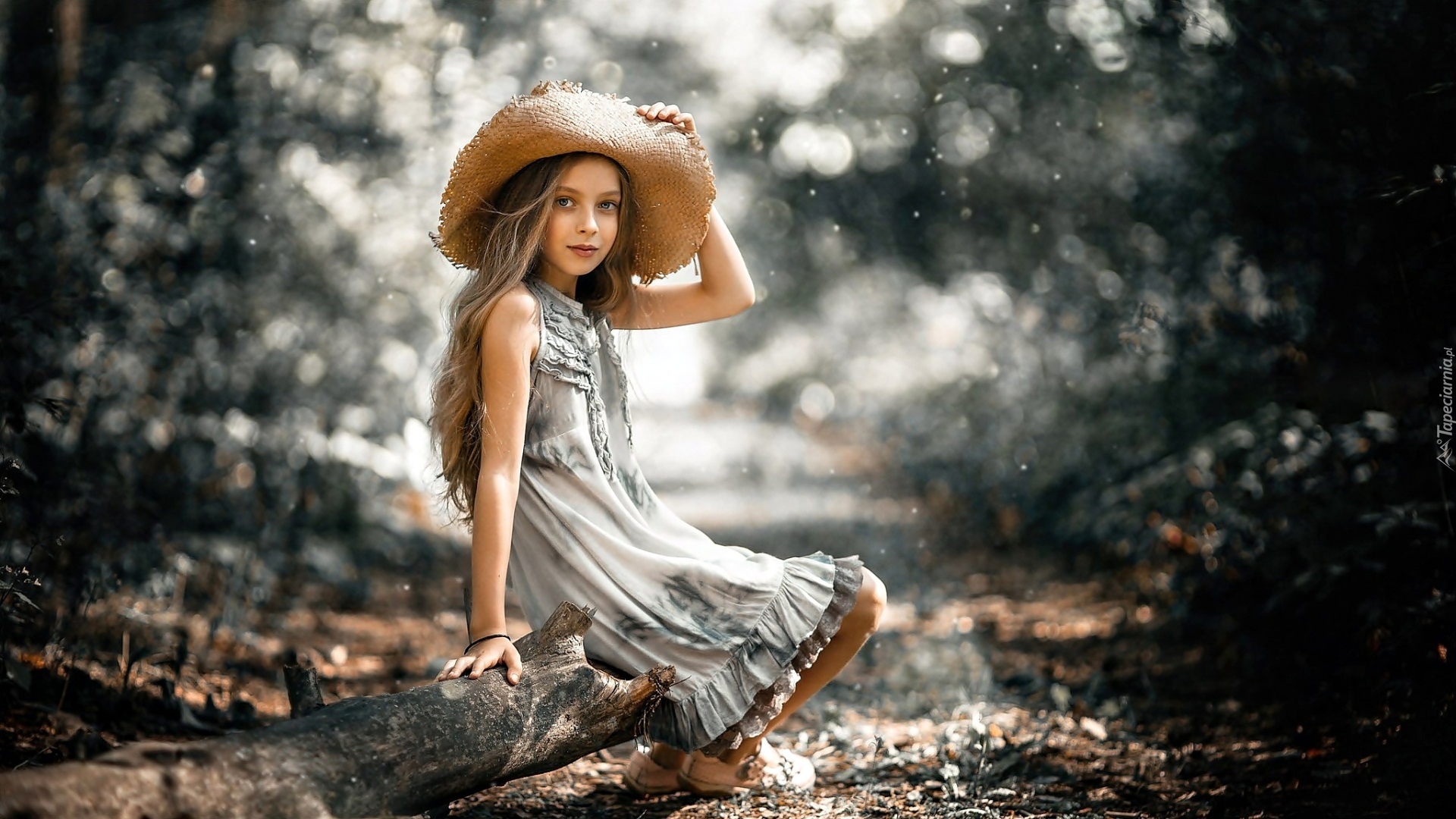 Edytor tapety: Dziewczynka w plecionym kapeluszu siedzi na kłodzie