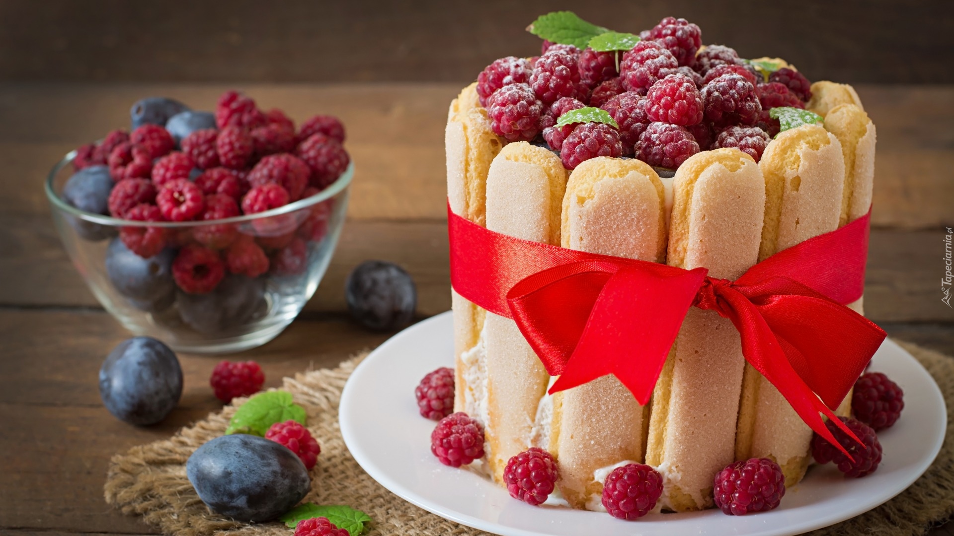 Edytor tapety: Ciasto z biszkoptów z malinami przewiązane wstążką