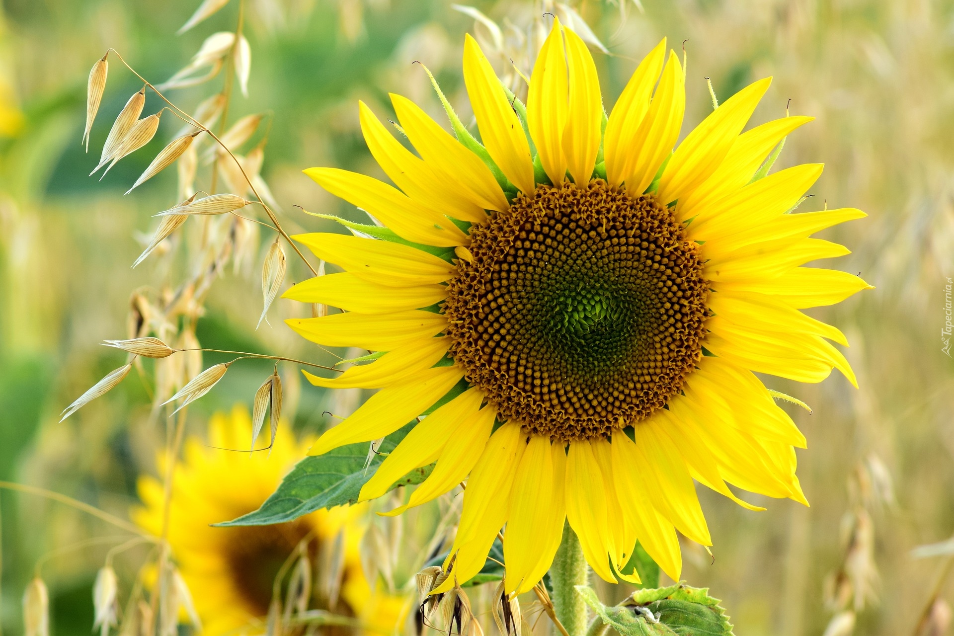 Edytor tapety: Rozświetlony słonecznik obok kłosów owsa
