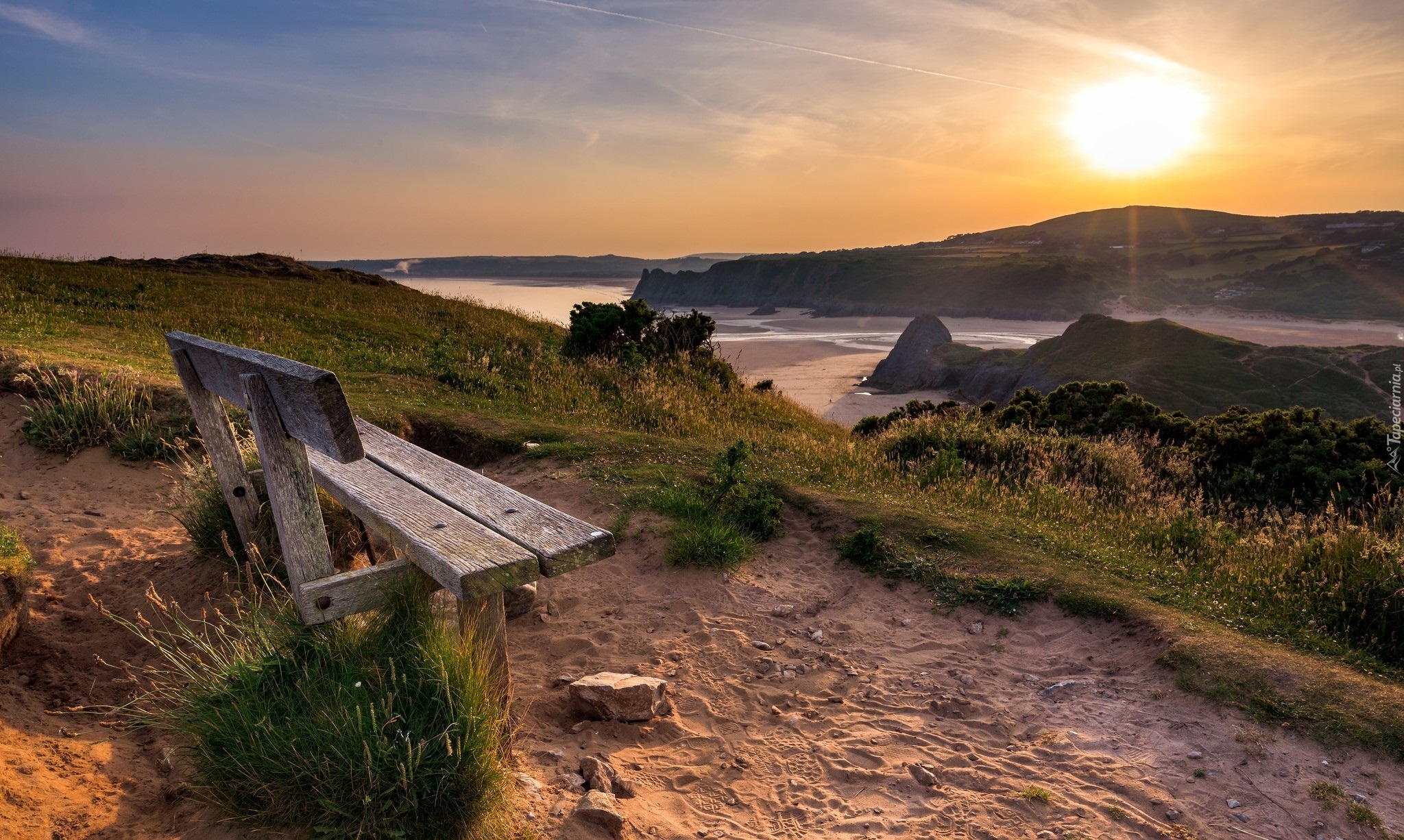 Edytor tapety: Drewniana ławka nad rzeką w promieniach zachodzącego słońca
