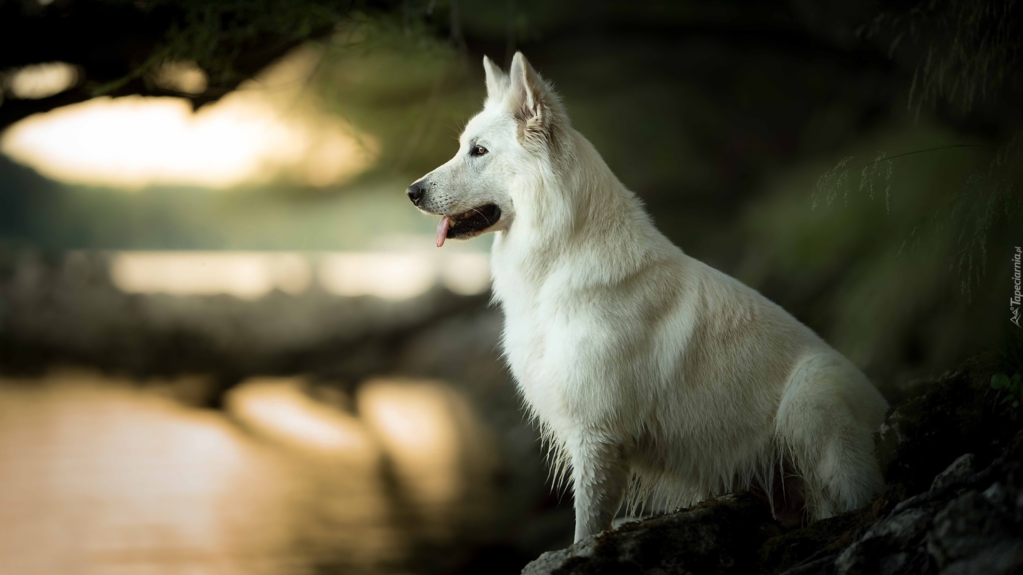 Edytor tapety: Biały owczarek szwajcarski nad wodą