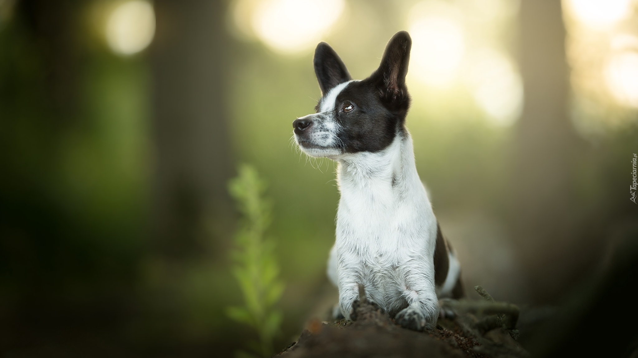 Edytor tapety: Biało-czarny pies oparty łapkami o pień