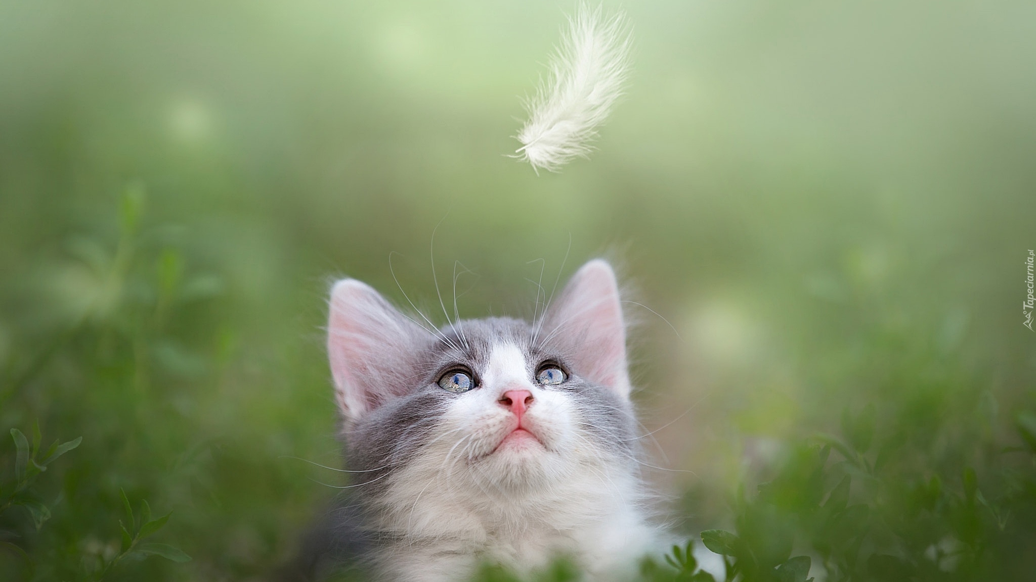 Edytor tapety: Kotek obserwujący spadające piórko