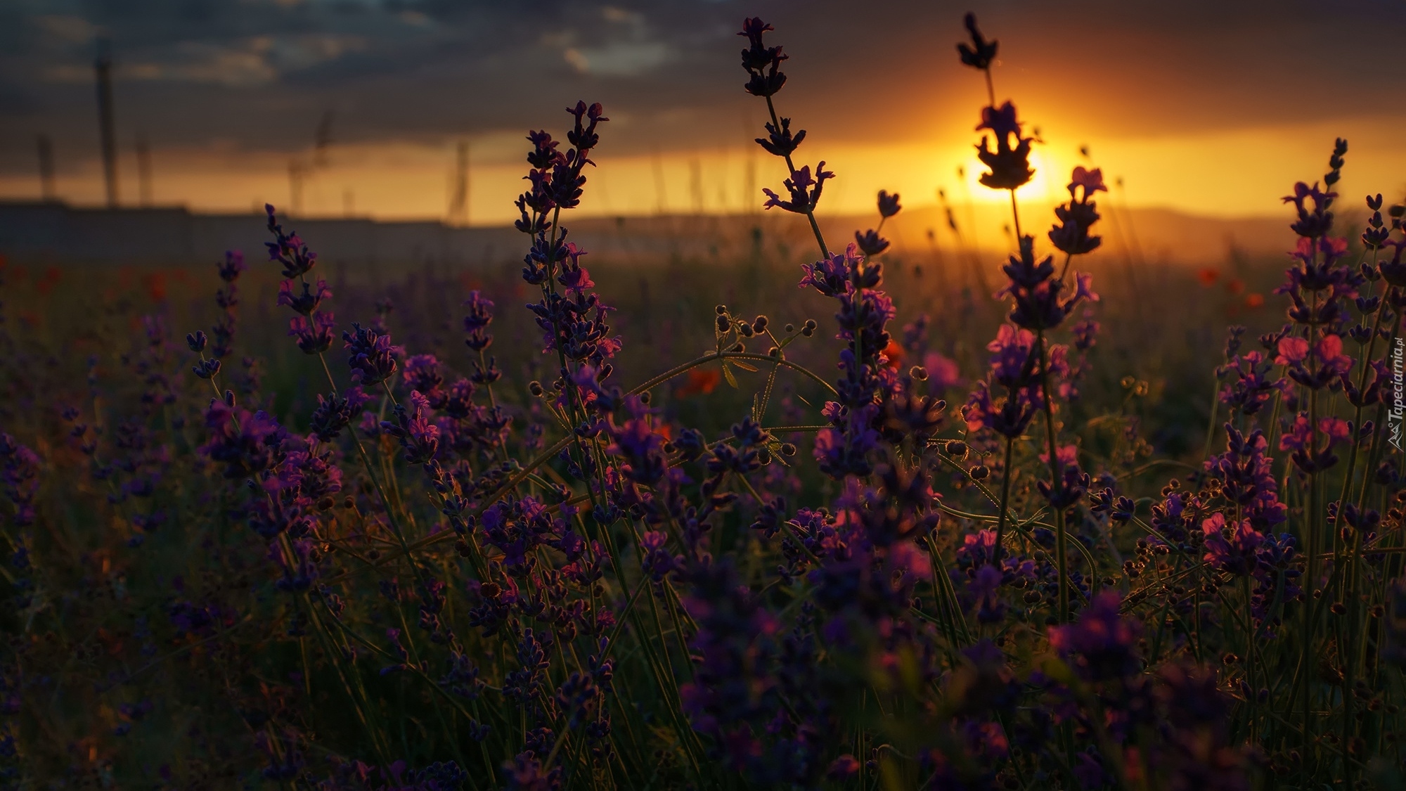 Edytor tapety: Kwiaty lawendy na łące w zachodzącym słońcu