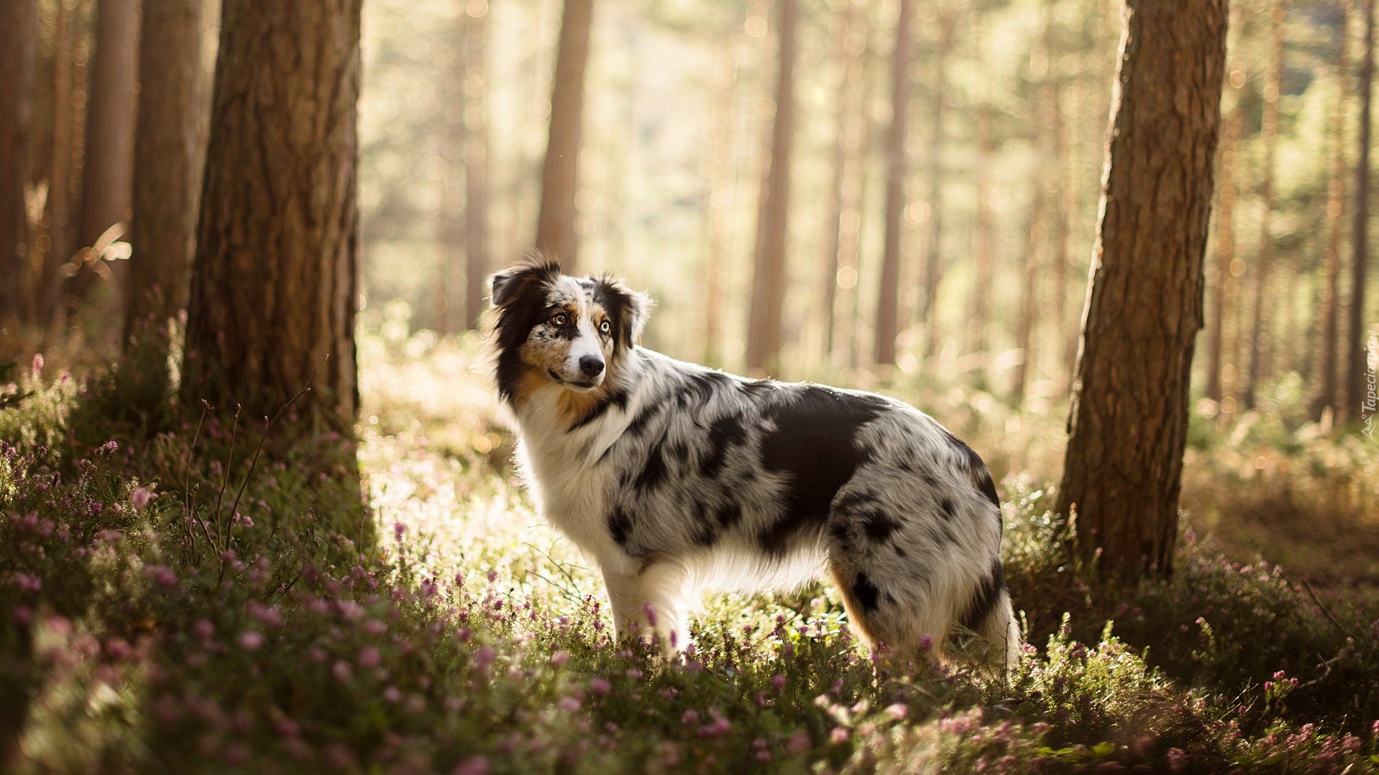 Edytor tapety: Owczarek australijski wędrujący po lesie
