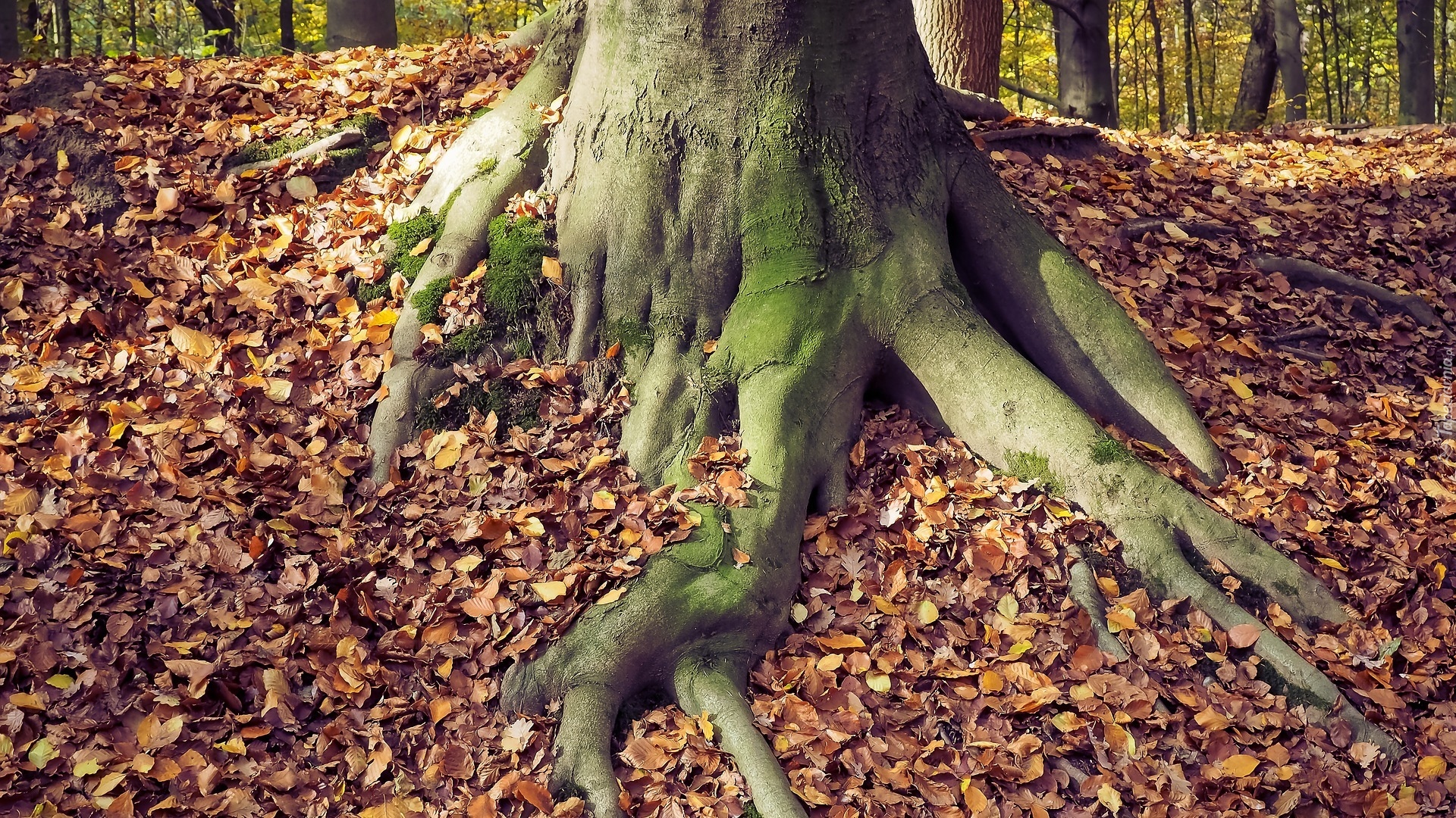 Edytor tapety: Wystające korzenie drzewa pośród liści