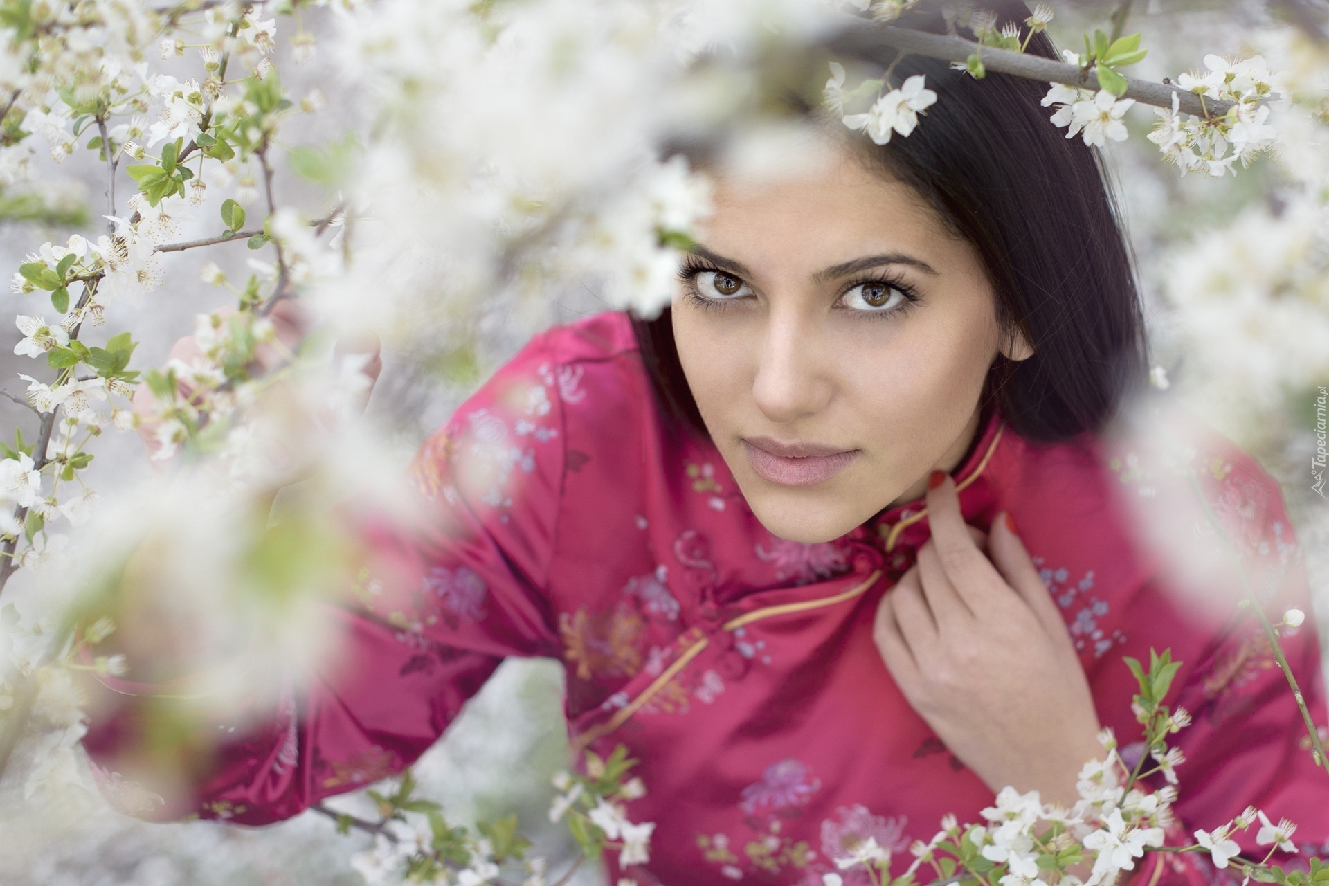 Edytor tapety: Brązowooka dziewczyna pod owocowym drzewem